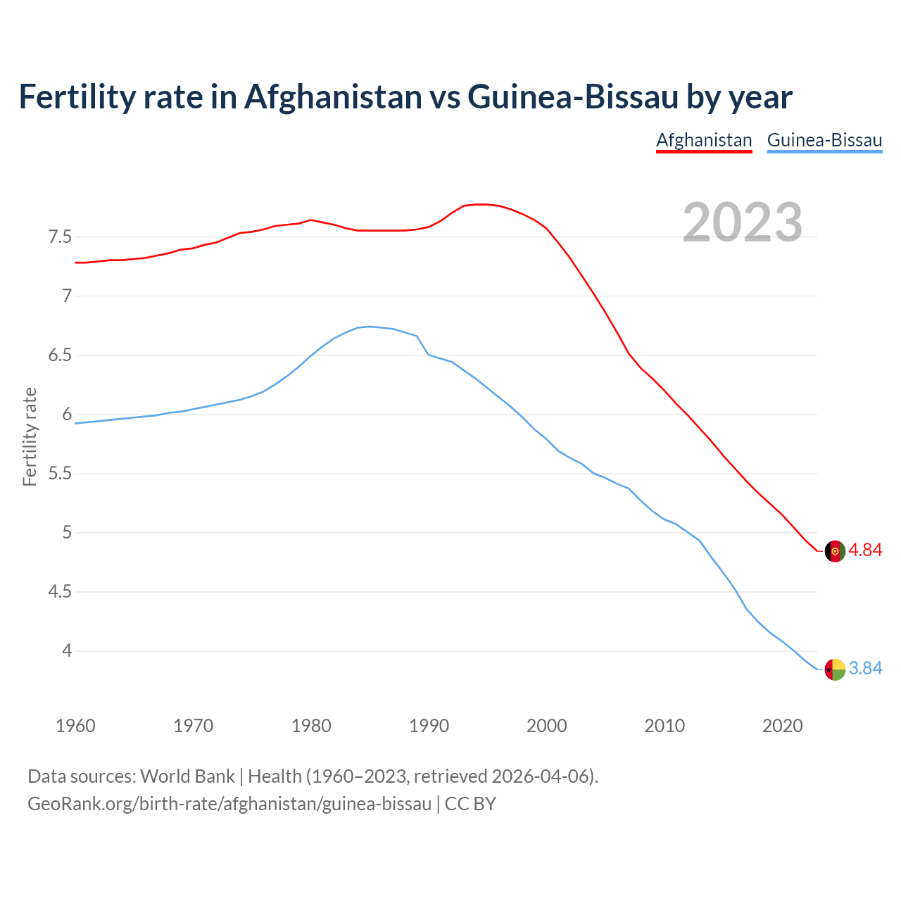 1960 vs 2023, the fertility rate has decreased by 33.5% in Afghanistan and by 35.2% in Guinea-Bissau — in 1960, it was 7.28 and 5.92, respectively.