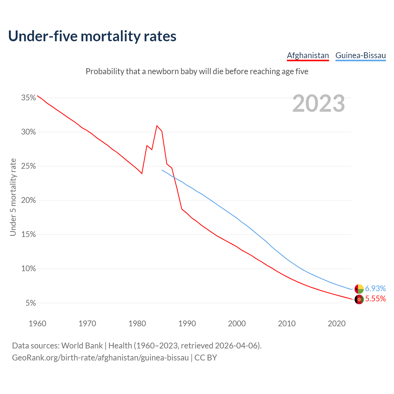 The chance that a newborn baby will die before reaching age five is 5.55% in Afghanistan and 6.93% in Guinea-Bissau. Above is a chart with historical data on under-five mortality rates.