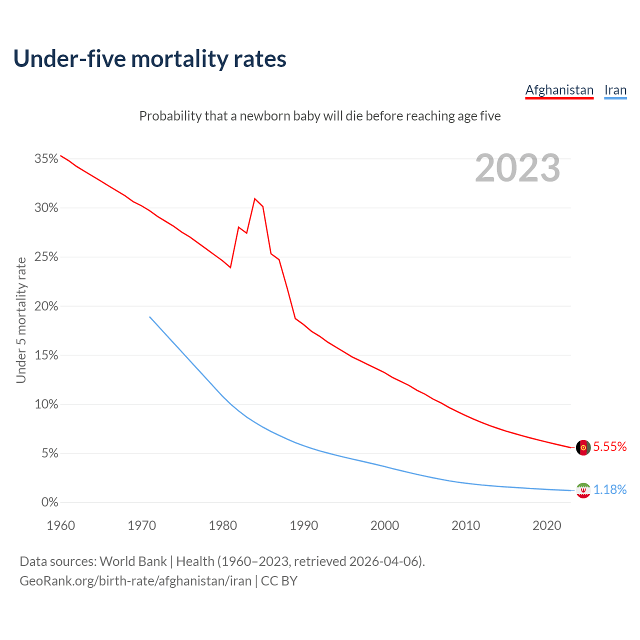 The chance that a newborn baby will die before reaching age five is 5.55% in Afghanistan and 1.18% in Iran. Above is a chart with historical data on under-five mortality rates.