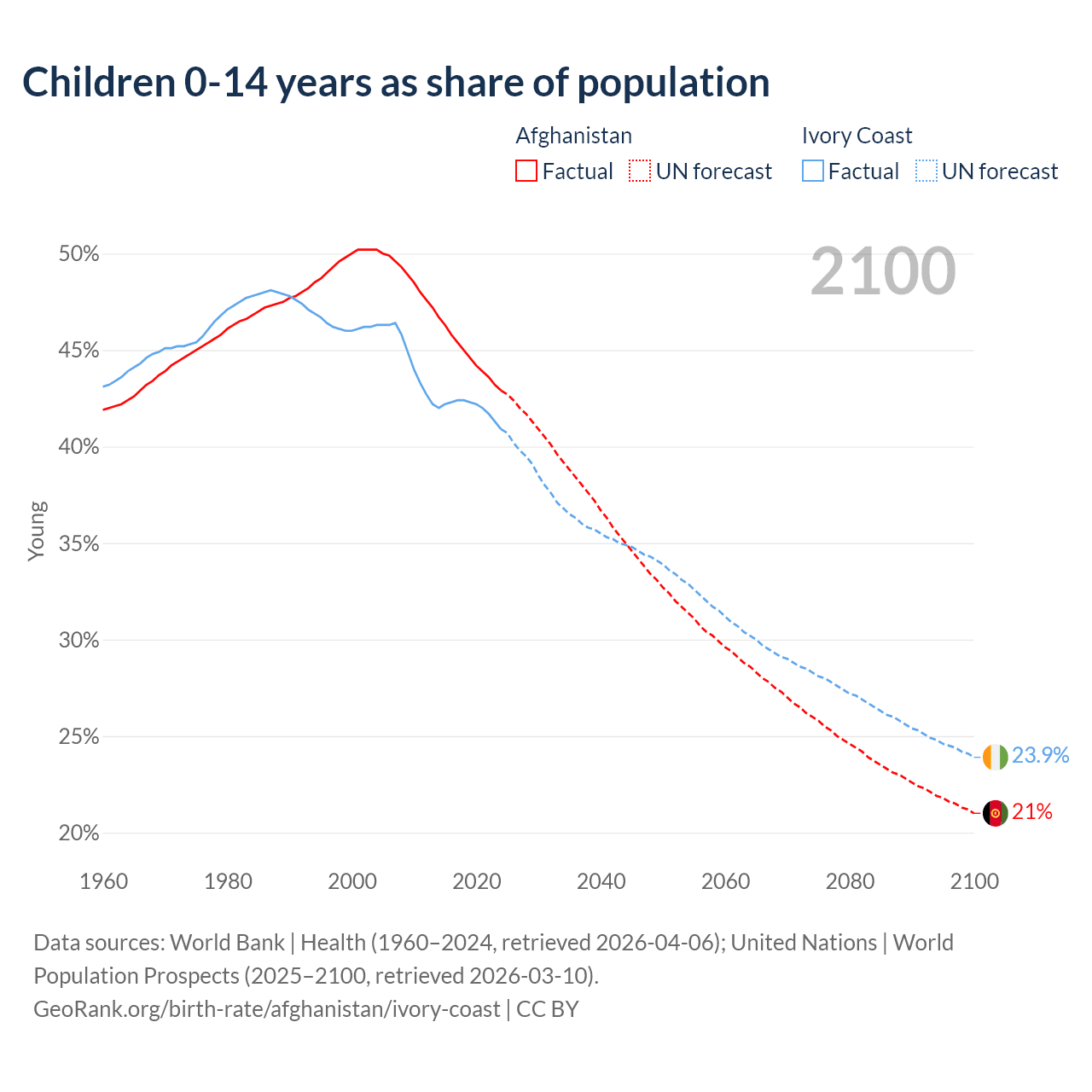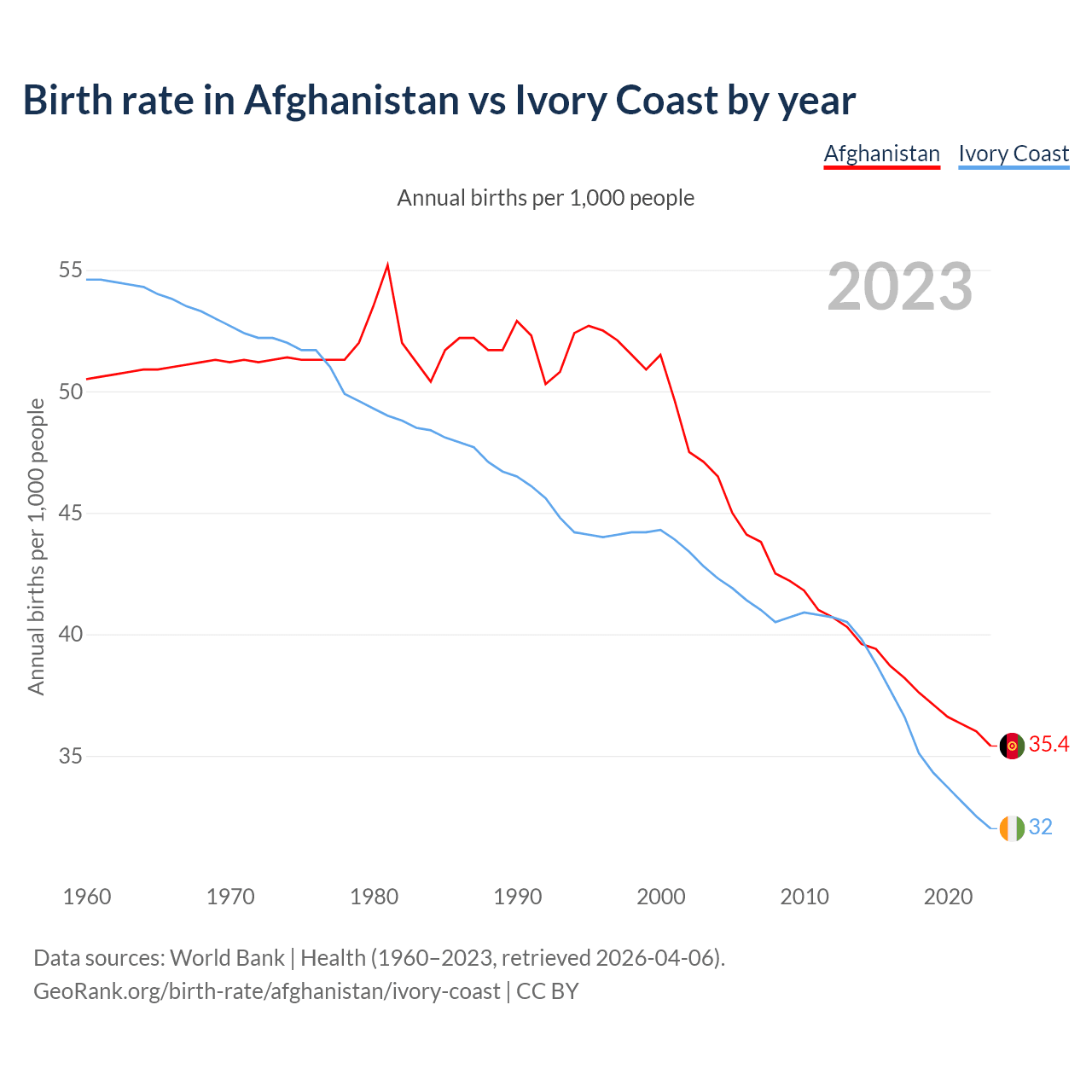 Afghanistan has an annual birth rate of 35.4 births per 1,000 people, compared to 32 for Ivory Coast. The average number of children a woman is expected to have during her lifetime — the fertility rate, is 4.84 in Afghanistan and 4.28 in Ivory Coast — 11.5% difference.