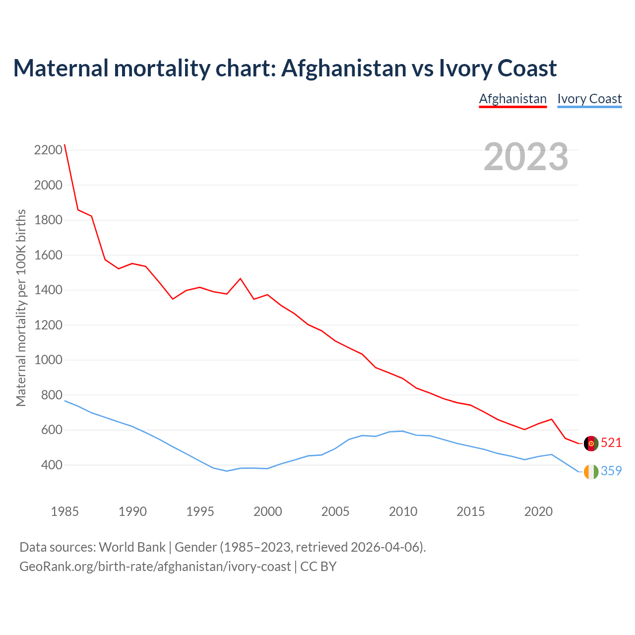 The maternal mortality rate, which is the probability of dying during childbirth or within 42 days of pregnancy termination, is 521 deaths per 100,000 live births in Afghanistan, compared to 359 deaths in Ivory Coast.