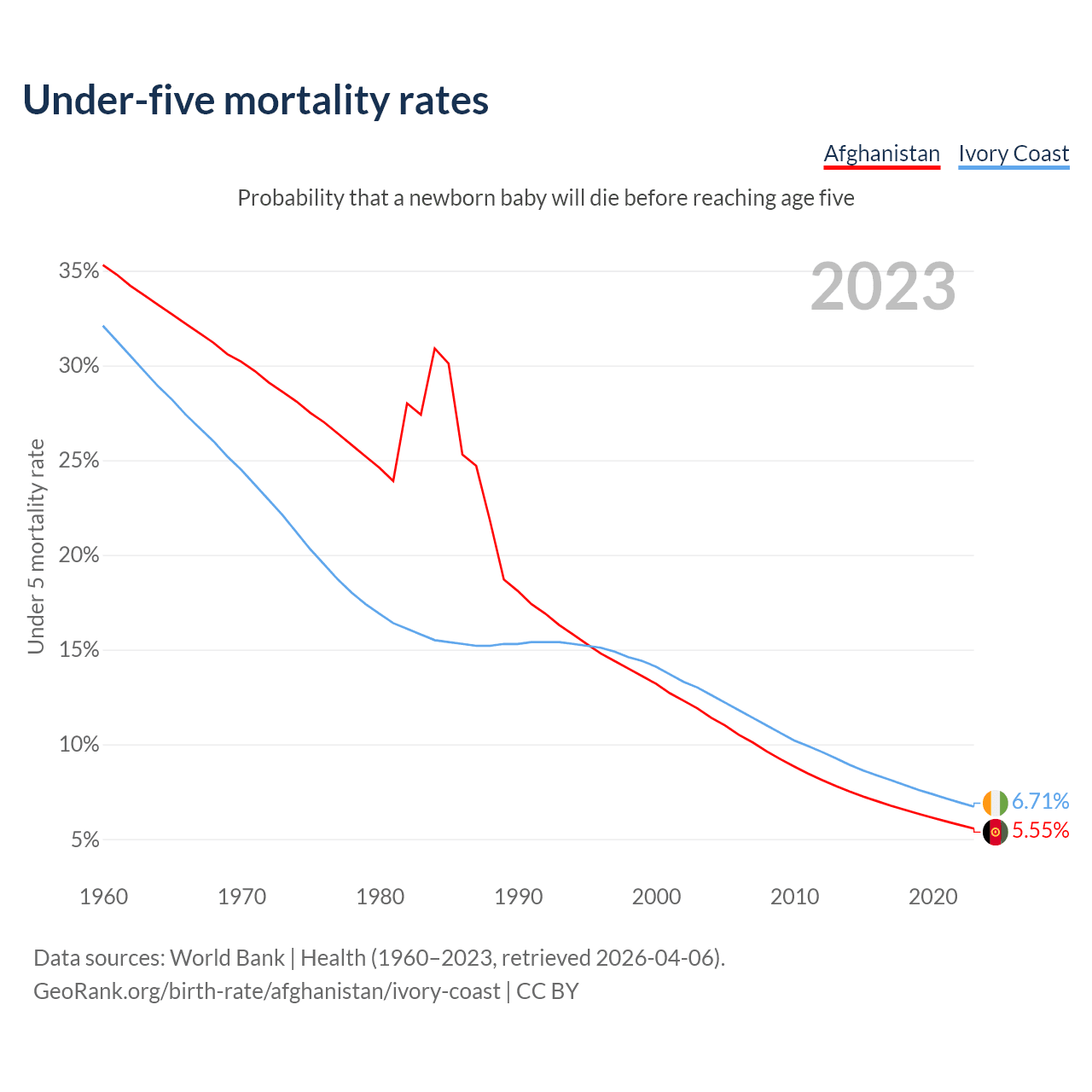 The chance that a newborn baby will die before reaching age five is 5.55% in Afghanistan and 6.71% in Ivory Coast. Above is a chart with historical data on under-five mortality rates.