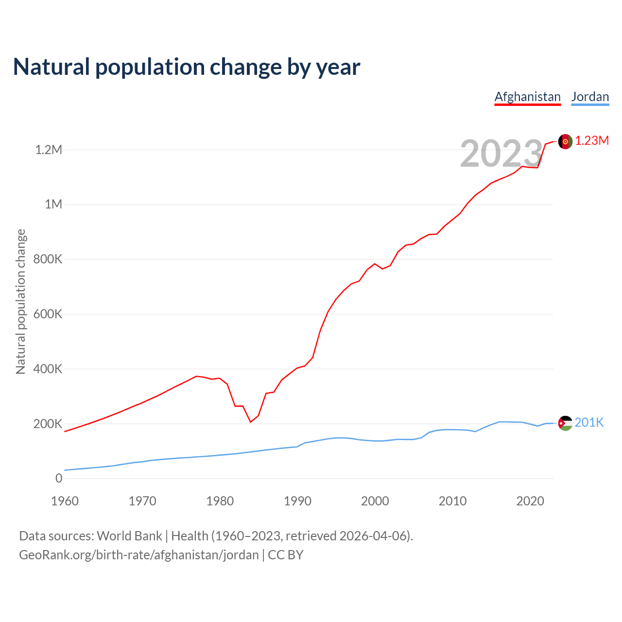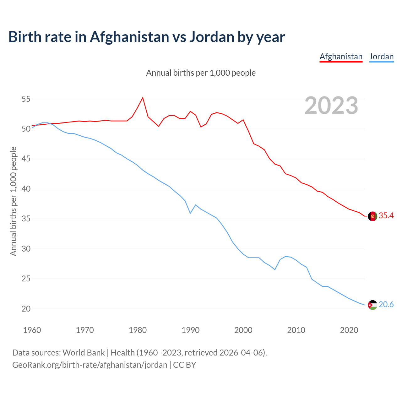 Afghanistan has an annual birth rate of 35.4 births per 1,000 people, compared to 20.6 for Jordan. The average number of children a woman is expected to have during her lifetime — the fertility rate, is 4.84 in Afghanistan and 2.64 in Jordan — 45.5% difference.