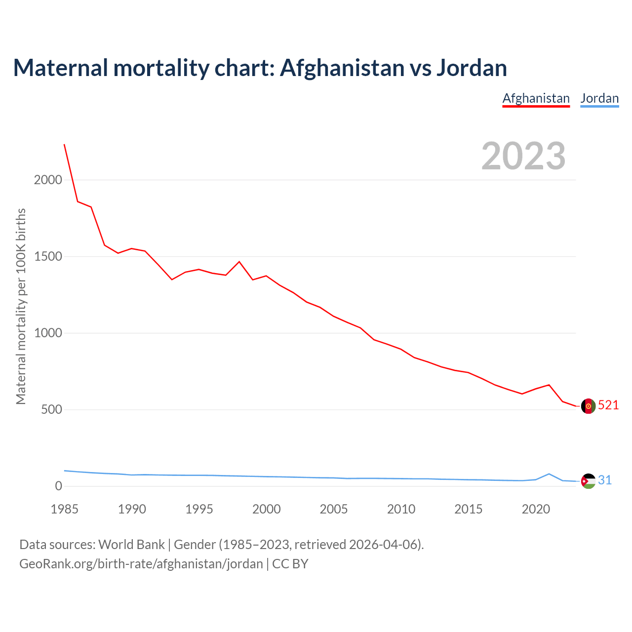 The maternal mortality rate, which is the probability of dying during childbirth or within 42 days of pregnancy termination, is 521 deaths per 100,000 live births in Afghanistan, compared to 31 deaths in Jordan.