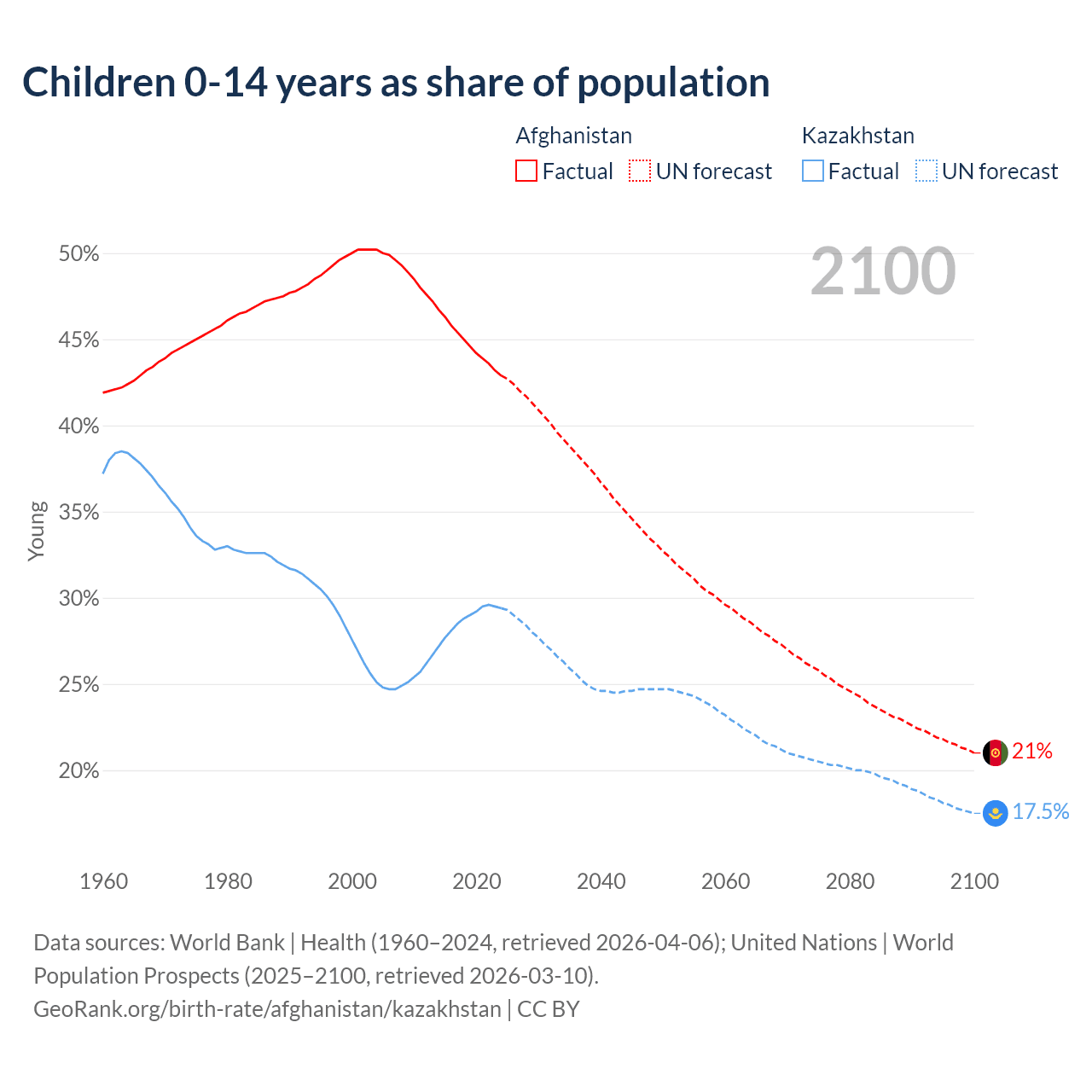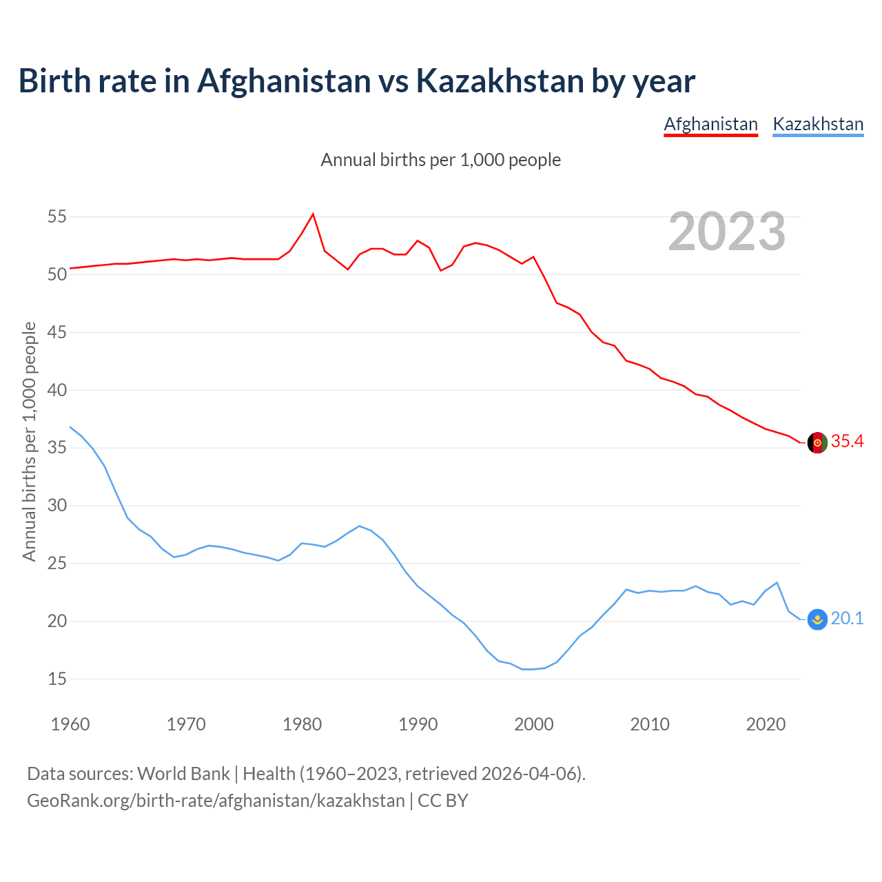 Afghanistan has an annual birth rate of 35.4 births per 1,000 people, compared to 20.1 for Kazakhstan. The average number of children a woman is expected to have during her lifetime — the fertility rate, is 4.84 in Afghanistan and 3.01 in Kazakhstan — 37.8% difference.