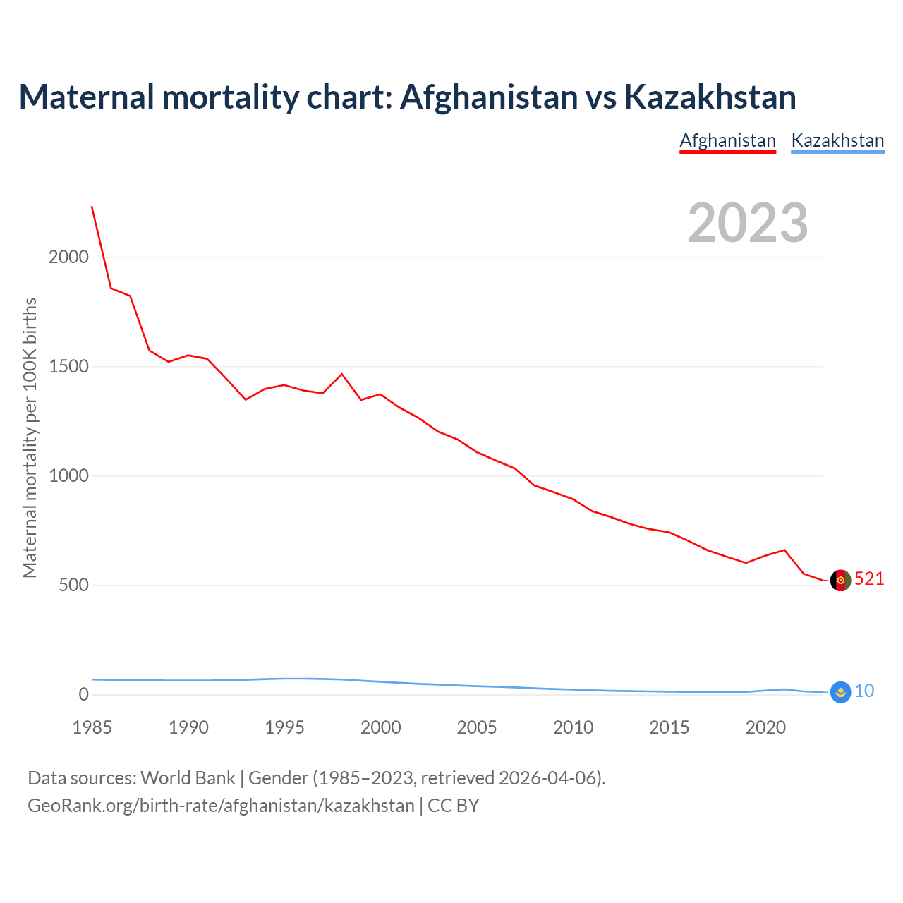 The maternal mortality rate, which is the probability of dying during childbirth or within 42 days of pregnancy termination, is 521 deaths per 100,000 live births in Afghanistan, compared to 10 deaths in Kazakhstan.