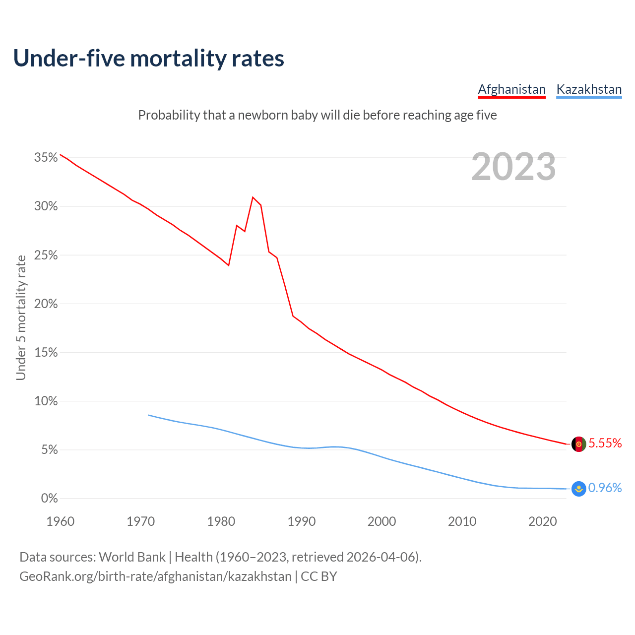 The chance that a newborn baby will die before reaching age five is 5.55% in Afghanistan and 0.96% in Kazakhstan. Above is a chart with historical data on under-five mortality rates.