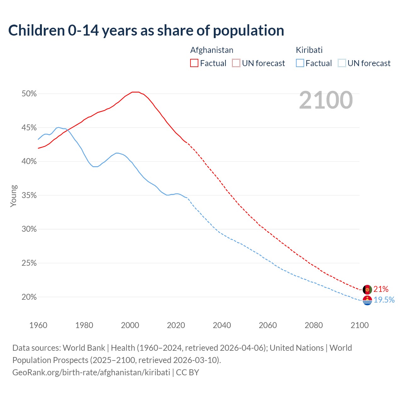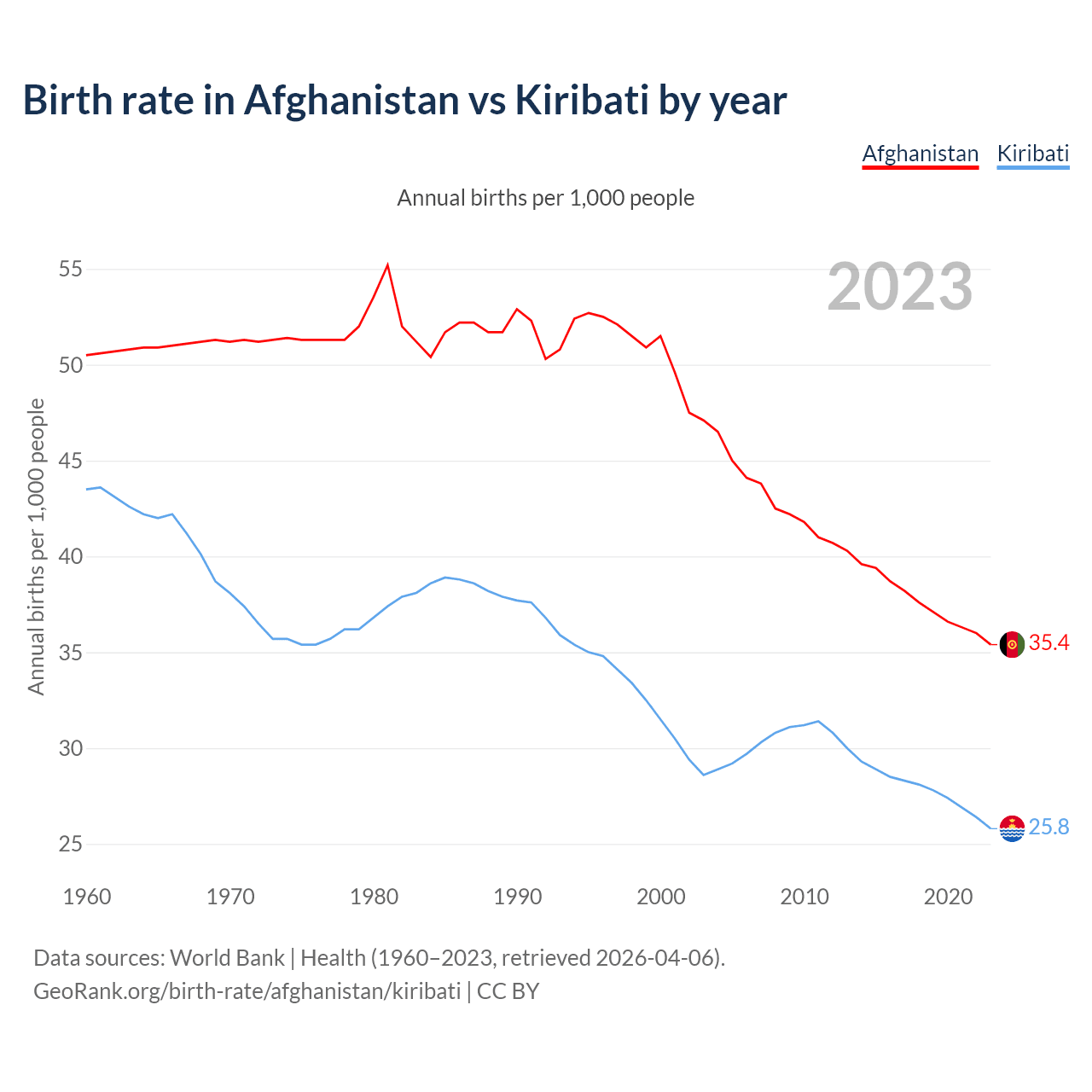 Afghanistan has an annual birth rate of 35.4 births per 1,000 people, compared to 25.8 for Kiribati. The average number of children a woman is expected to have during her lifetime — the fertility rate, is 4.84 in Afghanistan and 3.15 in Kiribati — 35% difference.