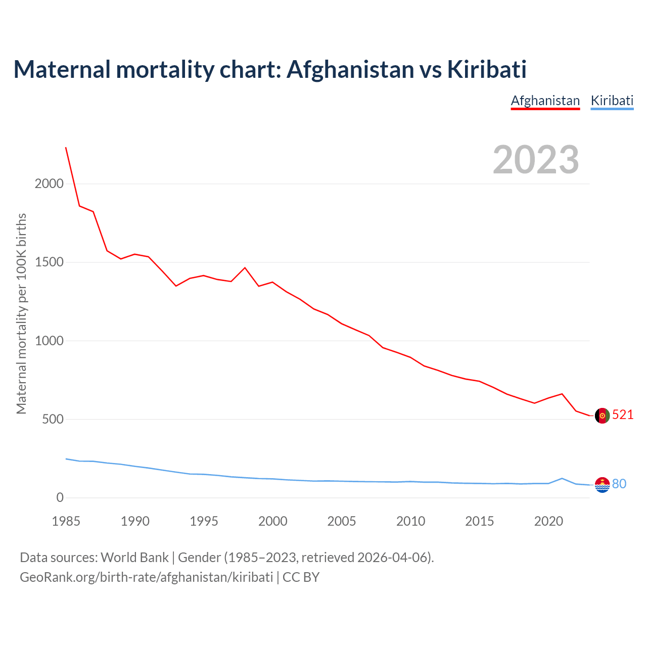 The maternal mortality rate, which is the probability of dying during childbirth or within 42 days of pregnancy termination, is 521 deaths per 100,000 live births in Afghanistan, compared to 80 deaths in Kiribati.