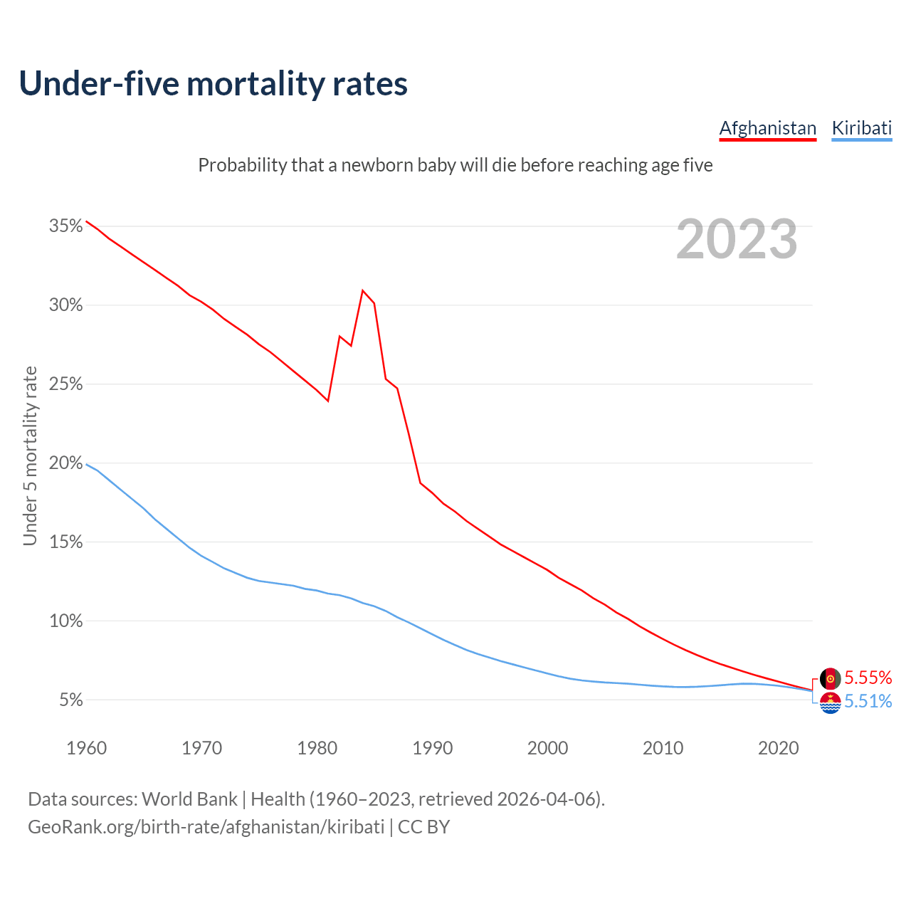 The chance that a newborn baby will die before reaching age five is 5.55% in Afghanistan and 5.51% in Kiribati. Above is a chart with historical data on under-five mortality rates.