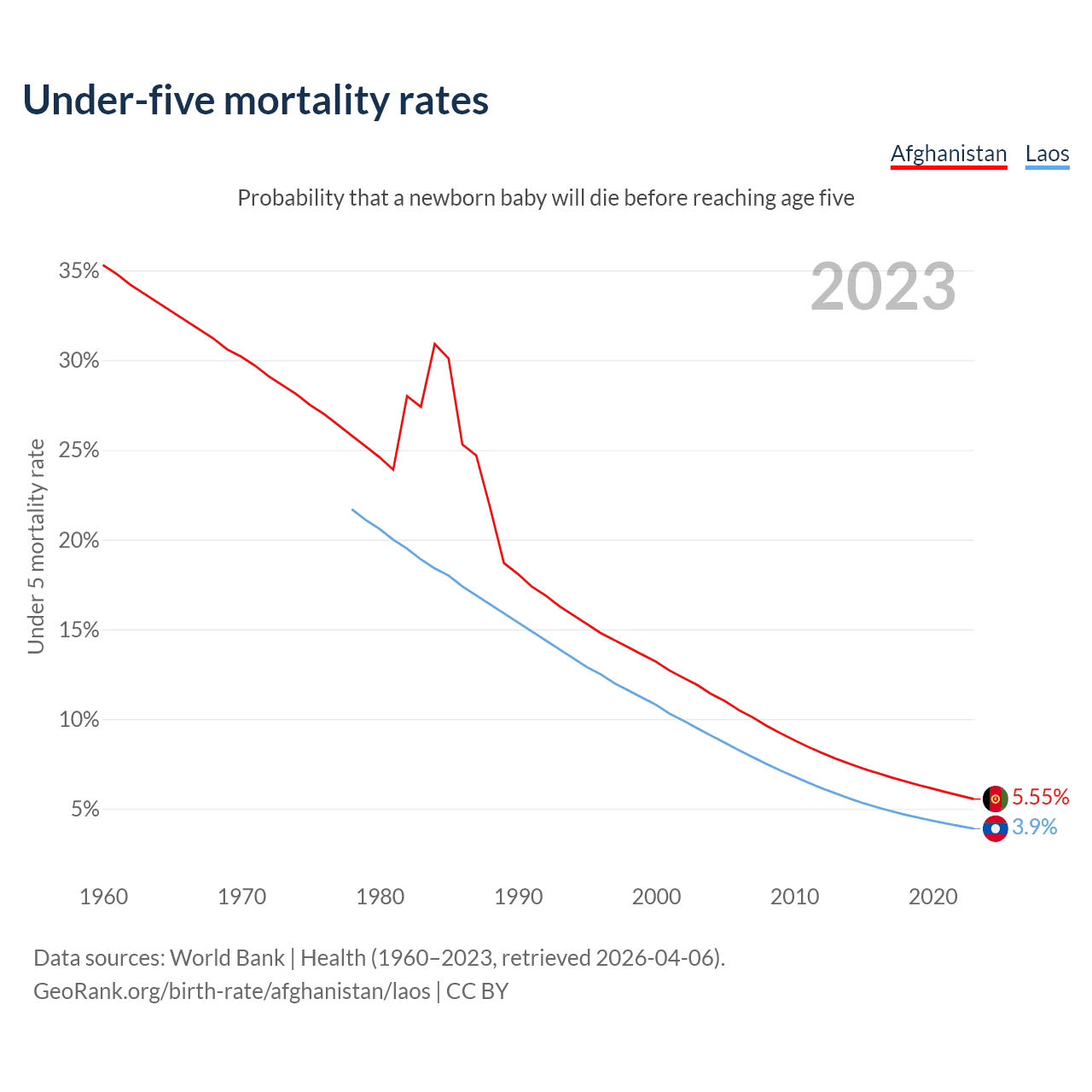 The chance that a newborn baby will die before reaching age five is 5.55% in Afghanistan and 3.9% in Laos. Above is a chart with historical data on under-five mortality rates.