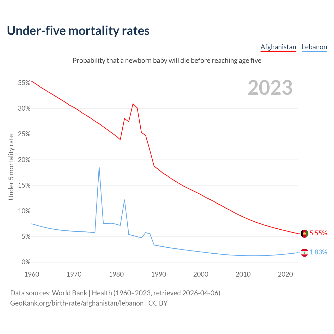 The chance that a newborn baby will die before reaching age five is 5.55% in Afghanistan and 1.83% in Lebanon. Above is a chart with historical data on under-five mortality rates.