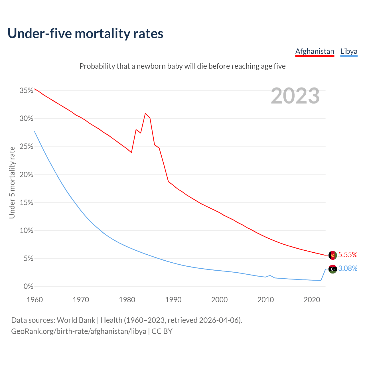The chance that a newborn baby will die before reaching age five is 5.55% in Afghanistan and 3.08% in Libya. Above is a chart with historical data on under-five mortality rates.