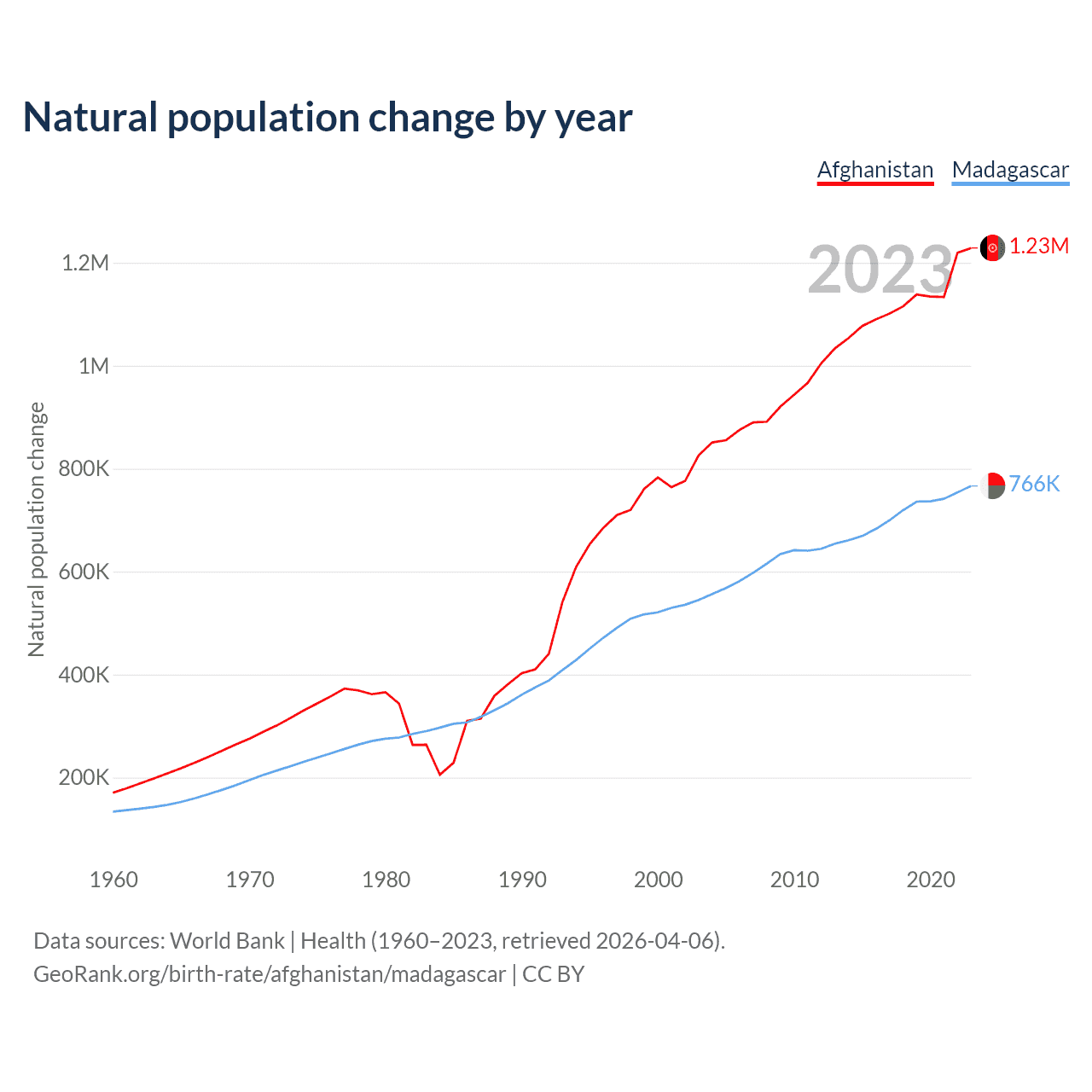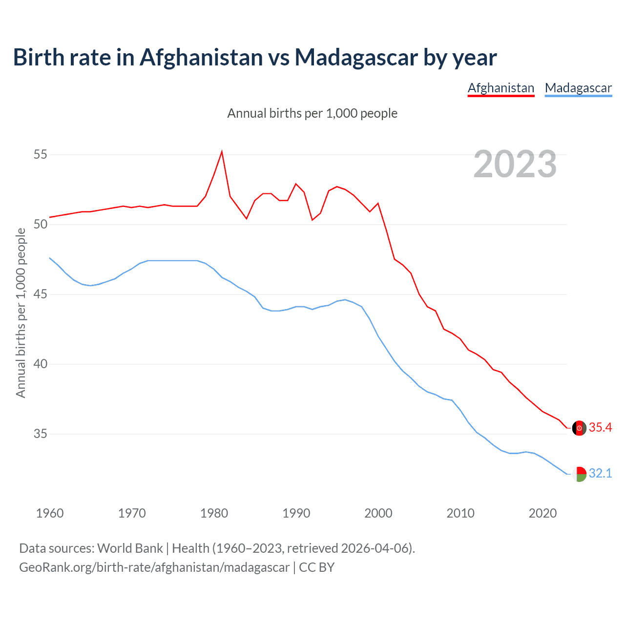 Afghanistan has an annual birth rate of 35.4 births per 1,000 people, compared to 32.1 for Madagascar. The average number of children a woman is expected to have during her lifetime — the fertility rate, is 4.84 in Afghanistan and 3.97 in Madagascar — 17.9% difference.