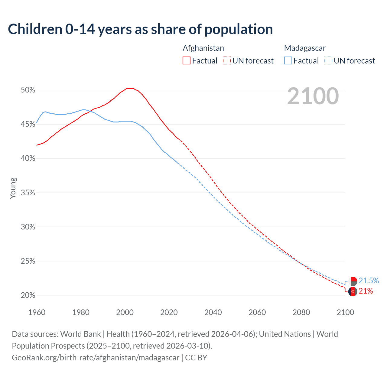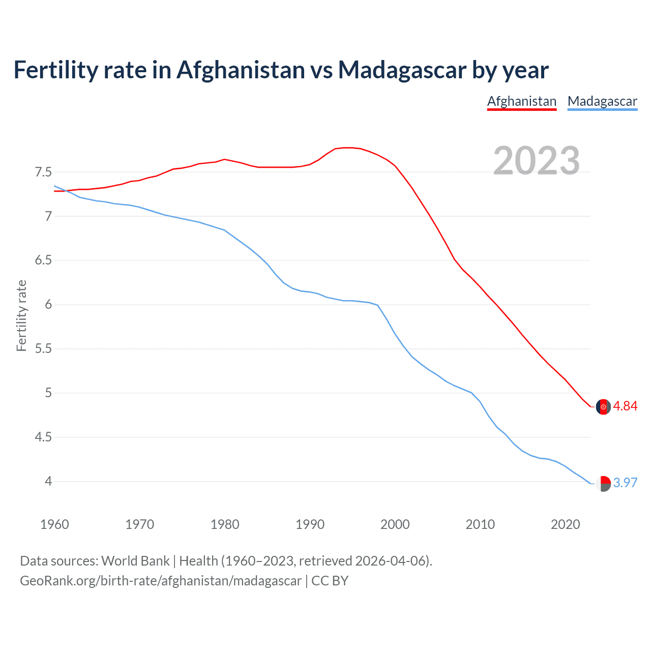 According to the latest available data on birth rates, the fertility rate in Afghanistan was 4.84 children per woman in 2023, compared to 3.97 in Madagascar in 2023. The replacement level is considered to be 2.1 children per woman.
