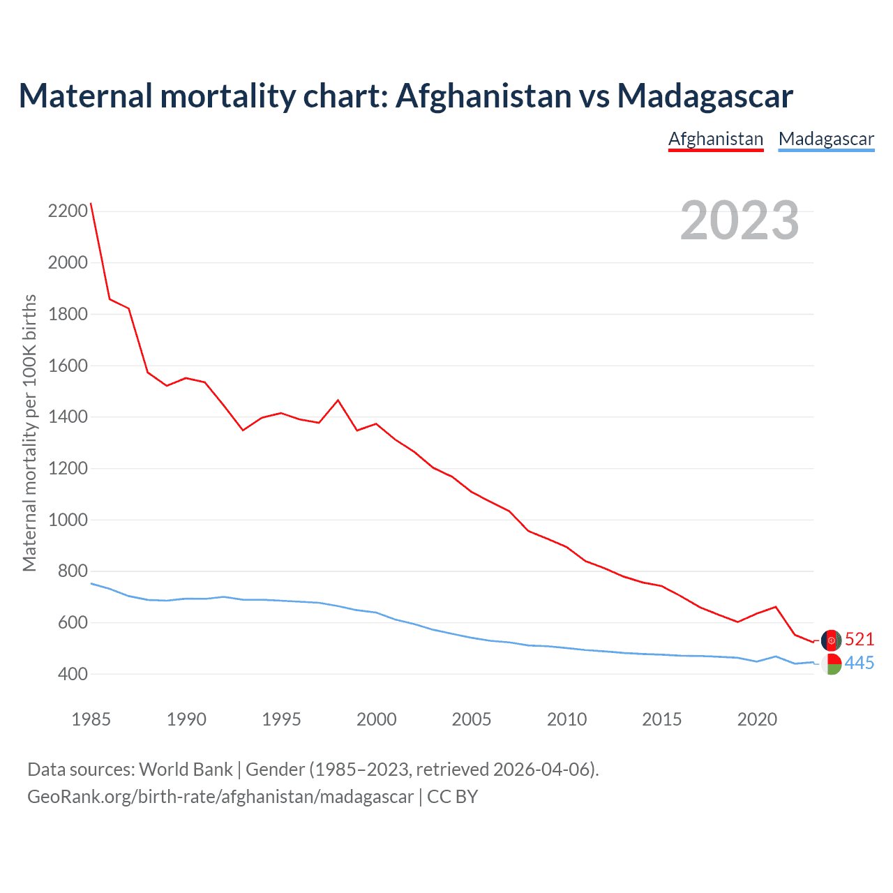 The maternal mortality rate, which is the probability of dying during childbirth or within 42 days of pregnancy termination, is 521 deaths per 100,000 live births in Afghanistan, compared to 445 deaths in Madagascar.