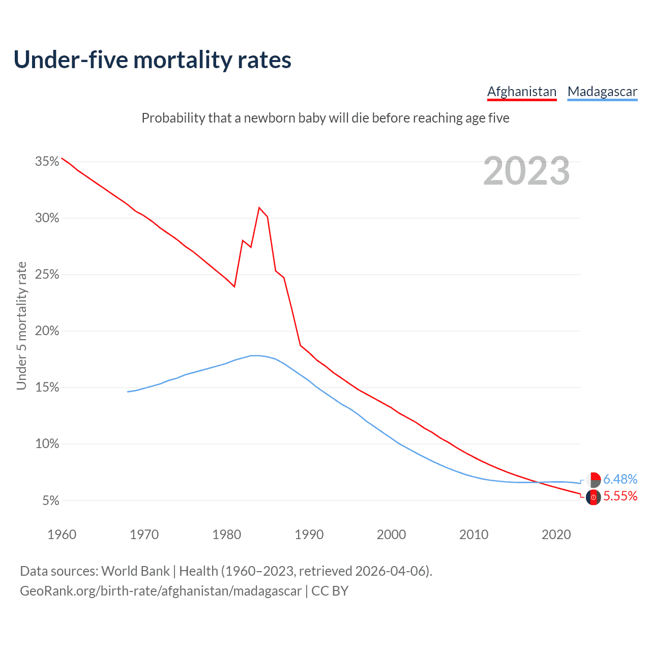 The chance that a newborn baby will die before reaching age five is 5.55% in Afghanistan and 6.48% in Madagascar. Above is a chart with historical data on under-five mortality rates.