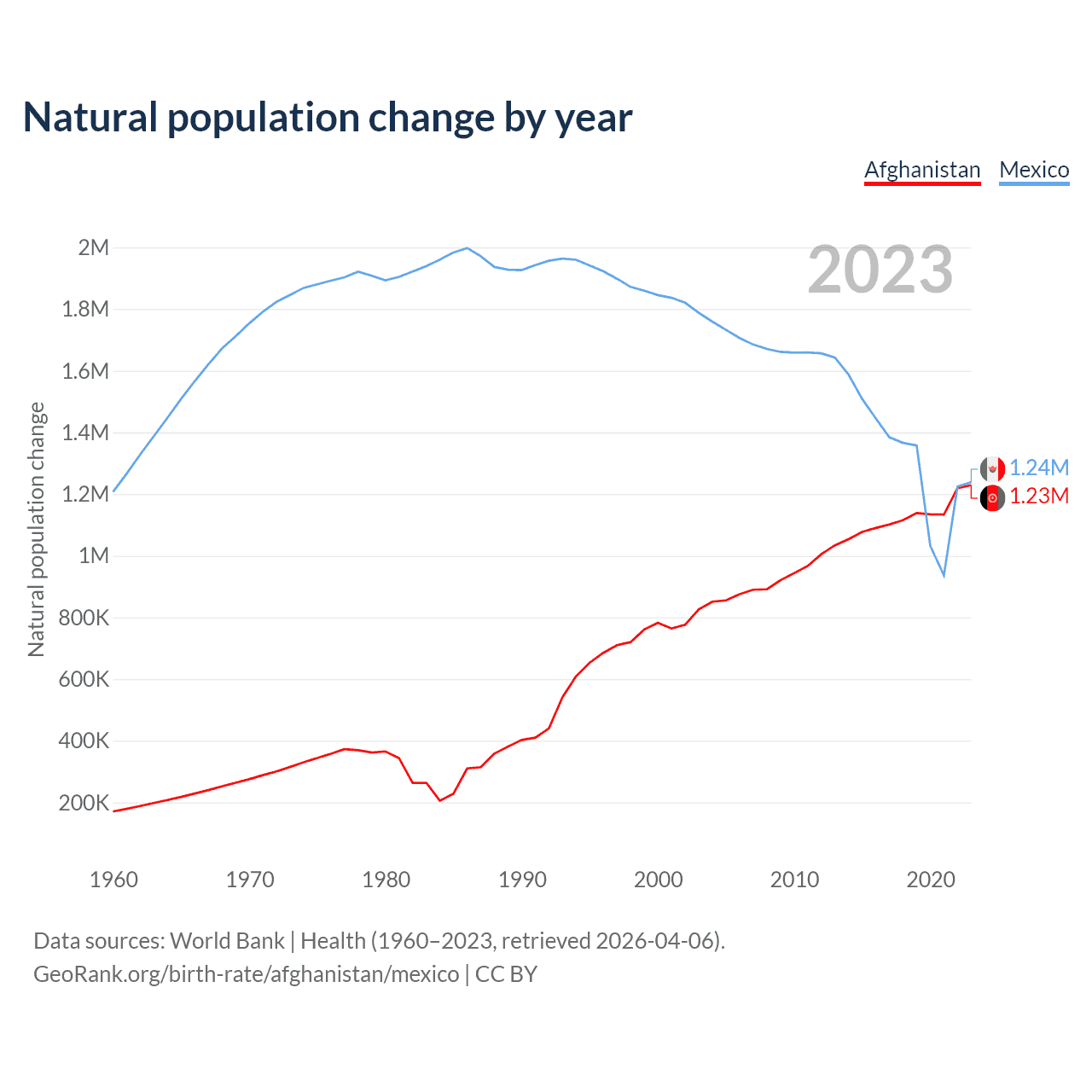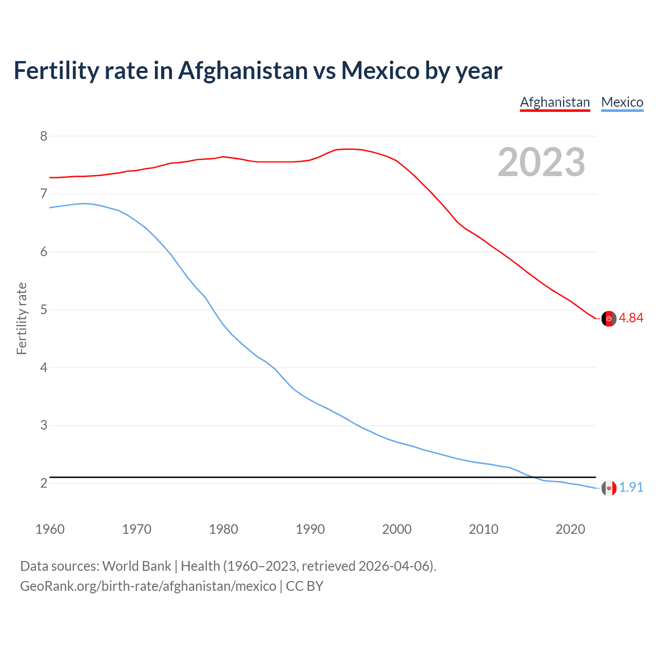 According to the latest available data on birth rates, the fertility rate in Afghanistan was 4.84 children per woman in 2023, compared to 1.91 in Mexico in 2023. The replacement level is considered to be 2.1 children per woman.