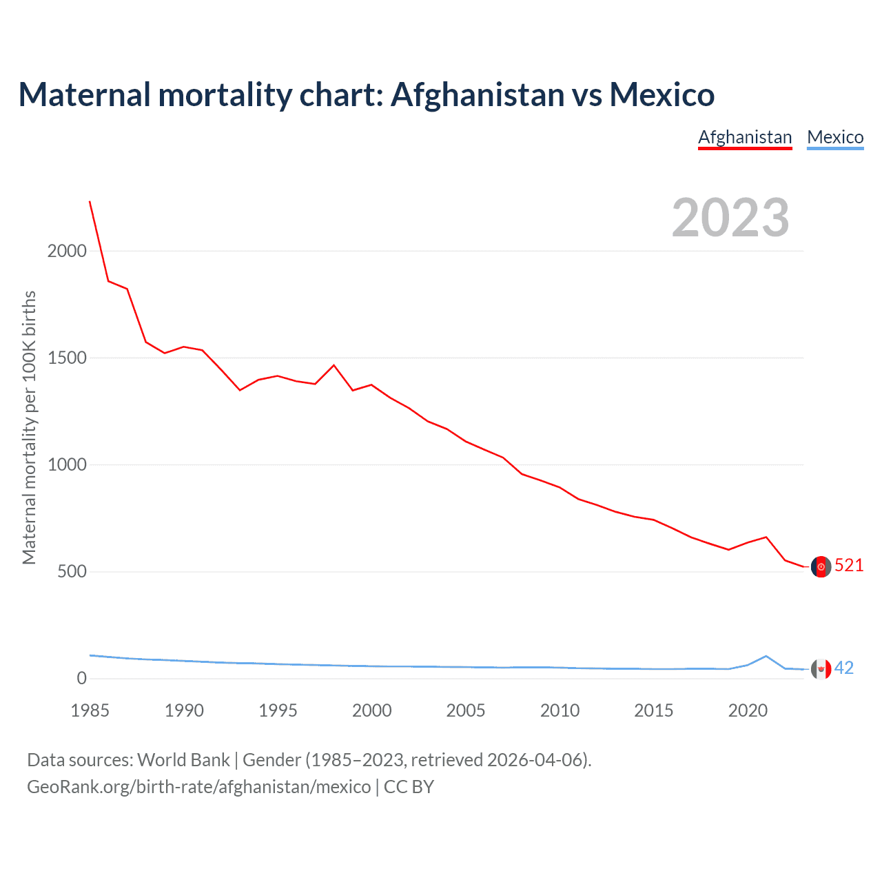 The maternal mortality rate, which is the probability of dying during childbirth or within 42 days of pregnancy termination, is 521 deaths per 100,000 live births in Afghanistan, compared to 42 deaths in Mexico.
