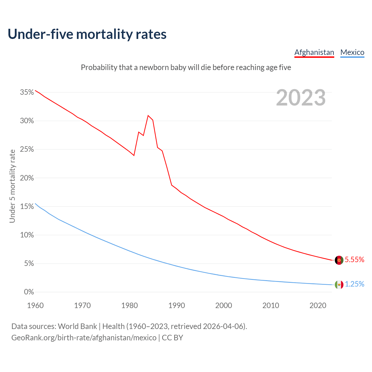 The chance that a newborn baby will die before reaching age five is 5.55% in Afghanistan and 1.25% in Mexico. Above is a chart with historical data on under-five mortality rates.