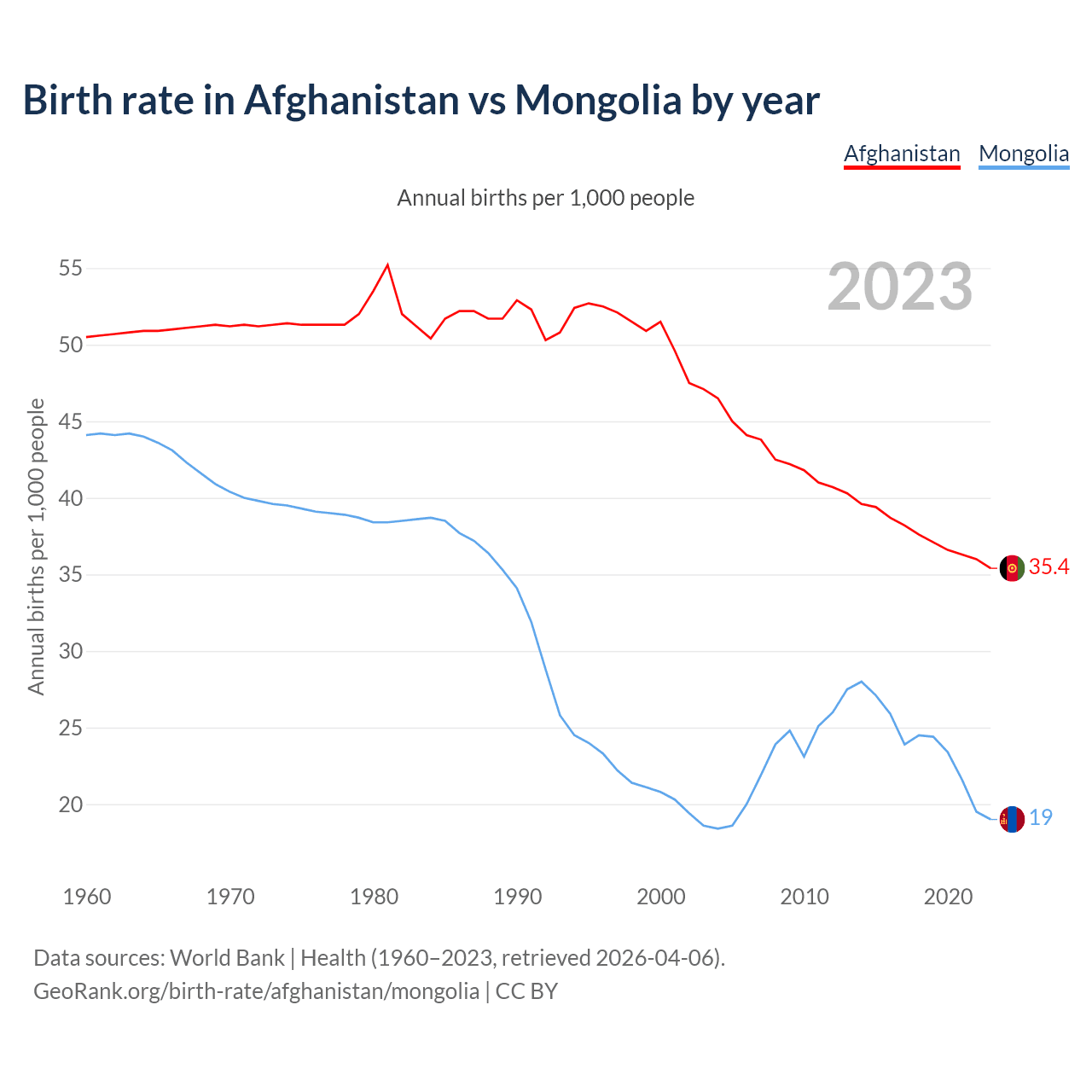Afghanistan has an annual birth rate of 35.4 births per 1,000 people, compared to 19 for Mongolia. The average number of children a woman is expected to have during her lifetime — the fertility rate, is 4.84 in Afghanistan and 2.7 in Mongolia — 44.2% difference.