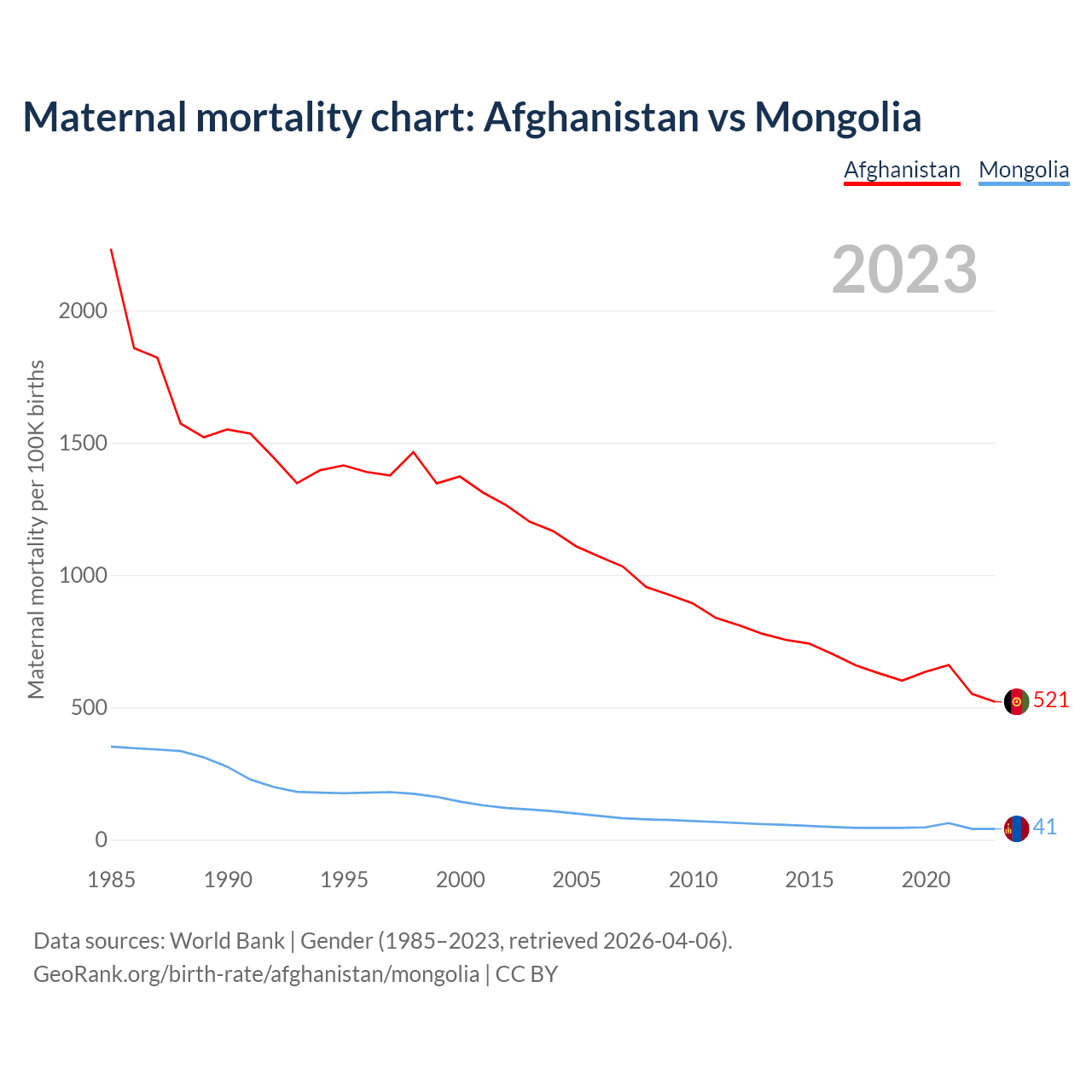 The maternal mortality rate, which is the probability of dying during childbirth or within 42 days of pregnancy termination, is 521 deaths per 100,000 live births in Afghanistan, compared to 41 deaths in Mongolia.