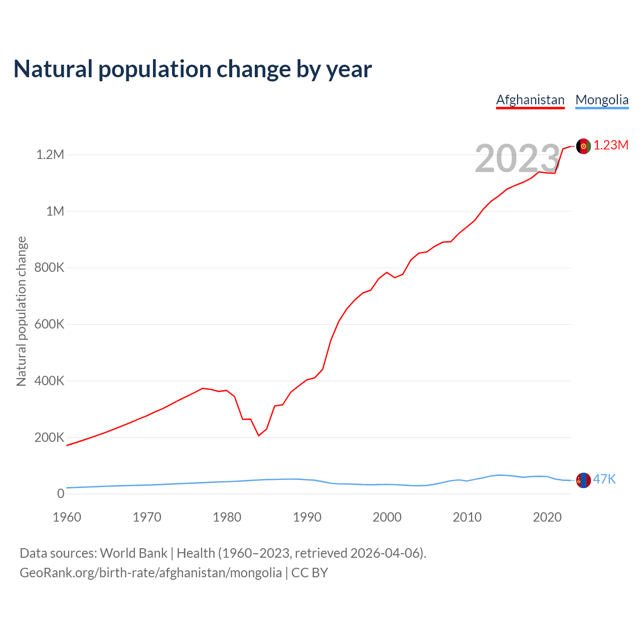 According to the latest available data on birth rates, the fertility rate in Afghanistan was 4.84 children per woman in 2023, compared to 2.7 in Mongolia in 2023. The replacement level is considered to be 2.1 children per woman.