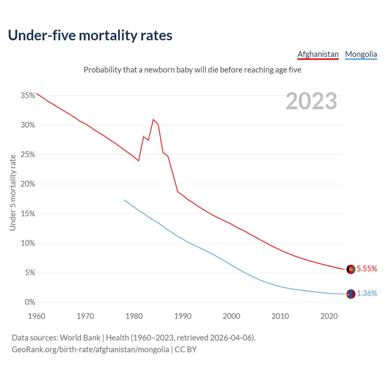 The chance that a newborn baby will die before reaching age five is 5.55% in Afghanistan and 1.36% in Mongolia. Above is a chart with historical data on under-five mortality rates.