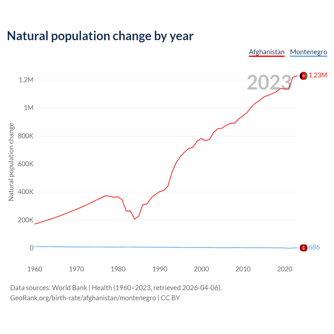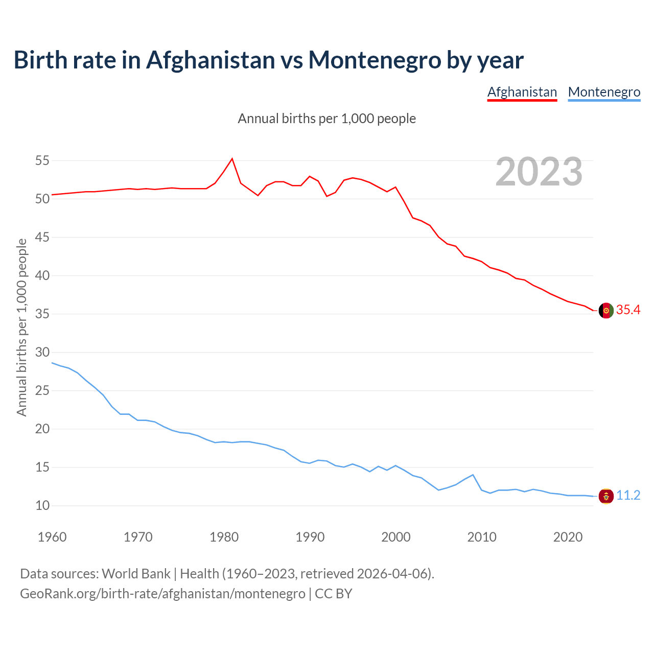 Afghanistan has an annual birth rate of 35.4 births per 1,000 people, compared to 11.2 for Montenegro. The average number of children a woman is expected to have during her lifetime — the fertility rate, is 4.84 in Afghanistan and 1.74 in Montenegro — 64% difference.