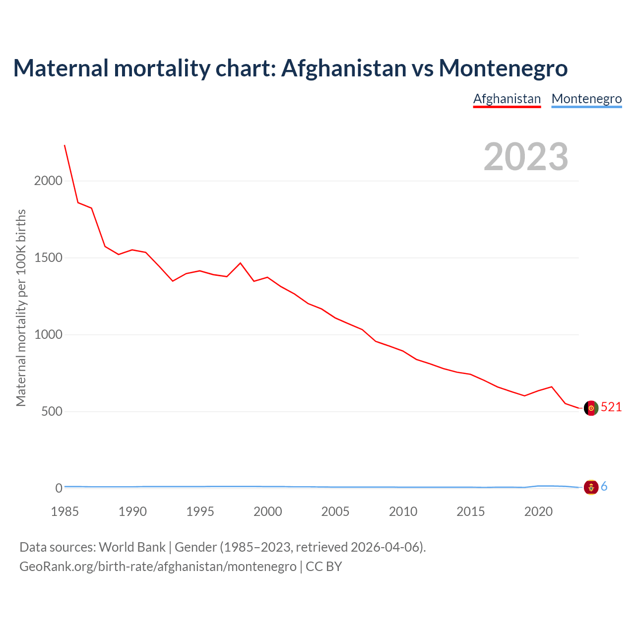 The maternal mortality rate, which is the probability of dying during childbirth or within 42 days of pregnancy termination, is 521 deaths per 100,000 live births in Afghanistan, compared to 6 deaths in Montenegro.