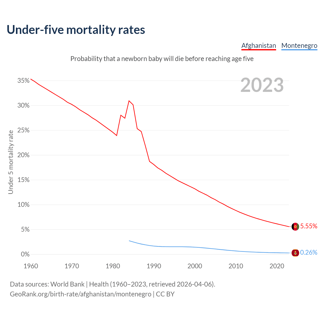 The chance that a newborn baby will die before reaching age five is 5.55% in Afghanistan and 0.26% in Montenegro. Above is a chart with historical data on under-five mortality rates.
