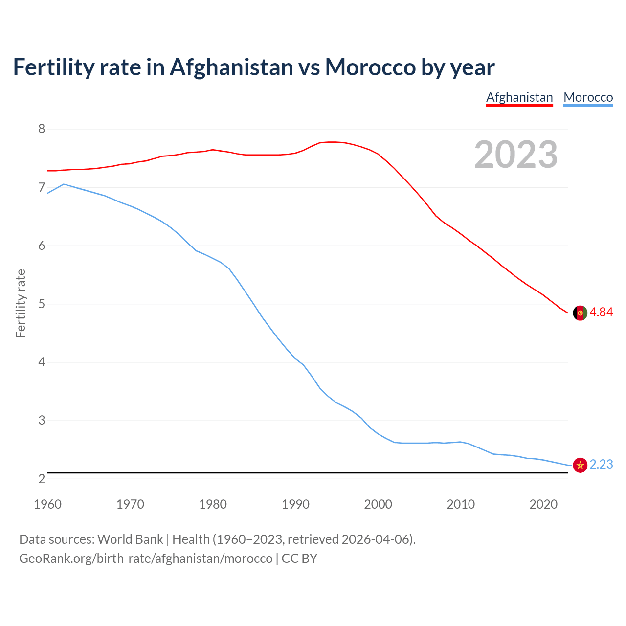 1960 vs 2023, the fertility rate has decreased by 33.5% in Afghanistan and by 67.6% in Morocco — in 1960, it was 7.28 and 6.89, respectively.