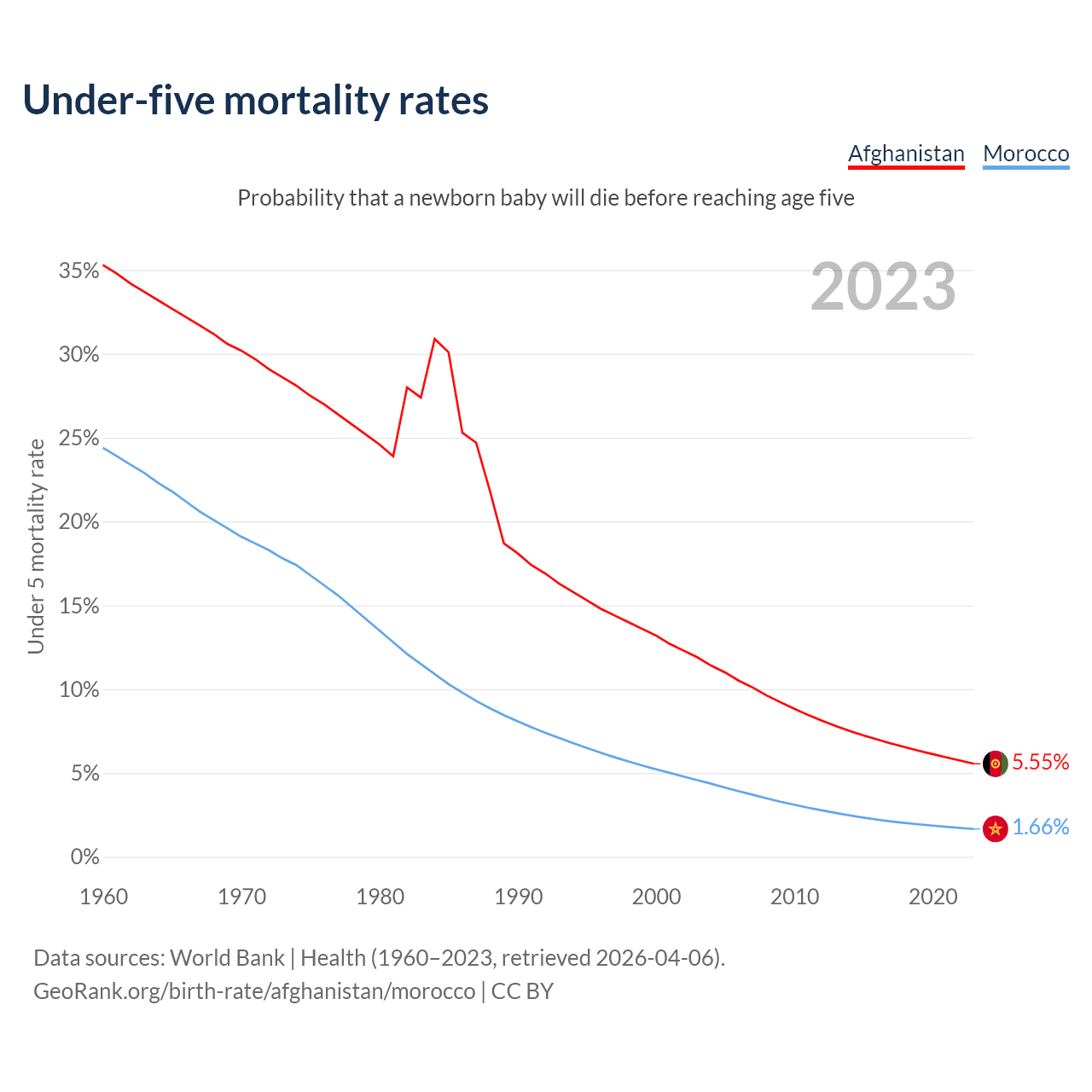 The chance that a newborn baby will die before reaching age five is 5.55% in Afghanistan and 1.66% in Morocco. Above is a chart with historical data on under-five mortality rates.