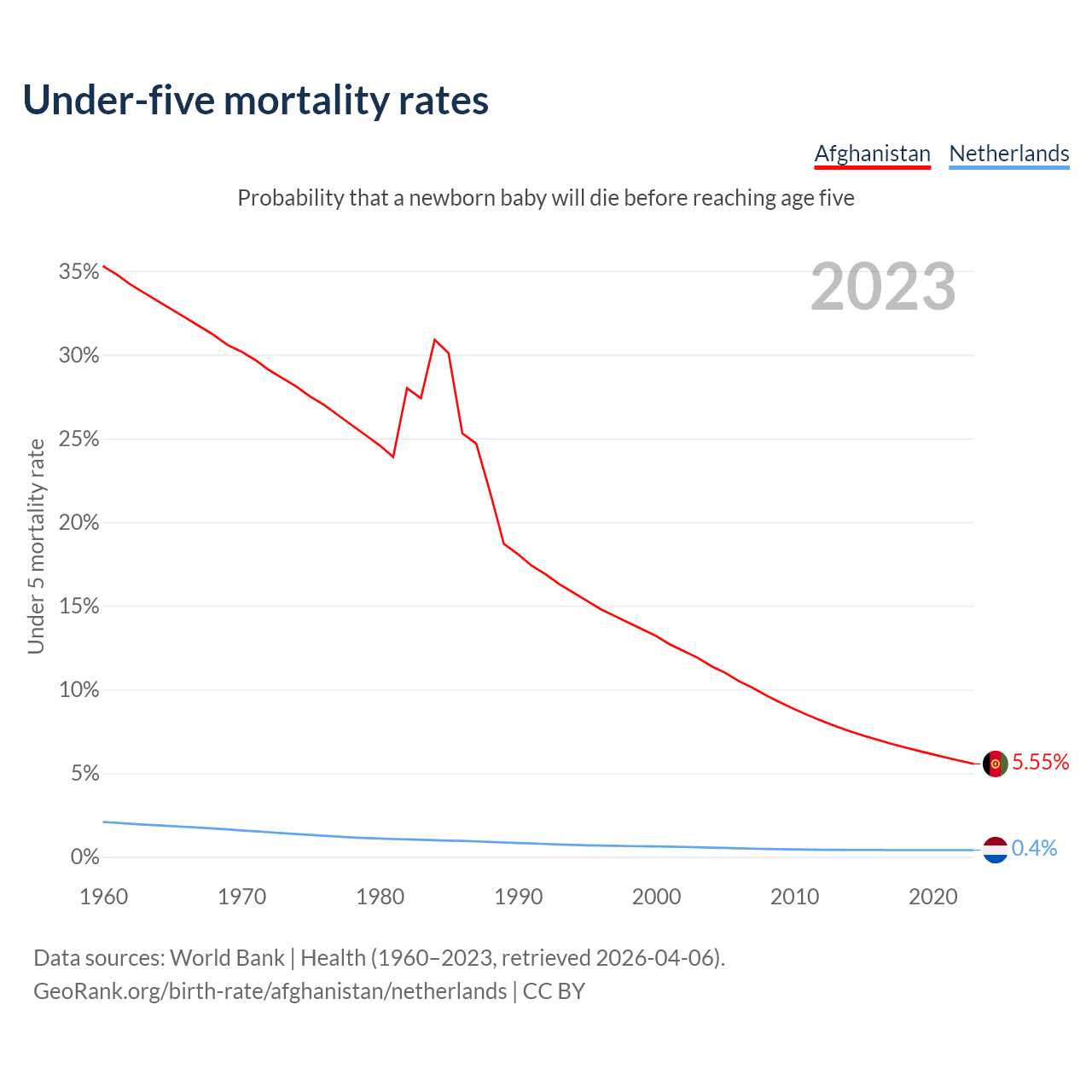 The chance that a newborn baby will die before reaching age five is 5.55% in Afghanistan and 0.4% in the Netherlands. Above is a chart with historical data on under-five mortality rates.