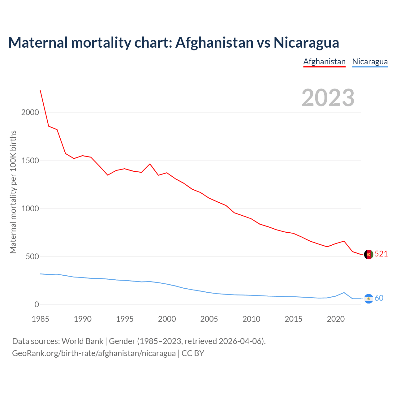 The maternal mortality rate, which is the probability of dying during childbirth or within 42 days of pregnancy termination, is 521 deaths per 100,000 live births in Afghanistan, compared to 60 deaths in Nicaragua.