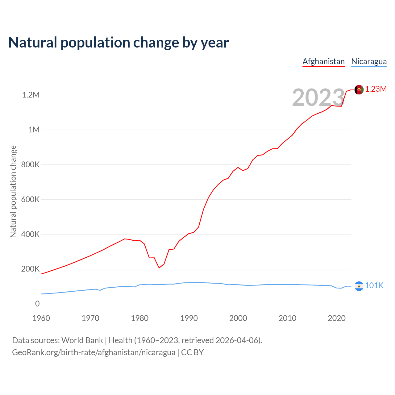 According to the latest available data on birth rates, the fertility rate in Afghanistan was 4.84 children per woman in 2023, compared to 2.22 in Nicaragua in 2023. The replacement level is considered to be 2.1 children per woman.