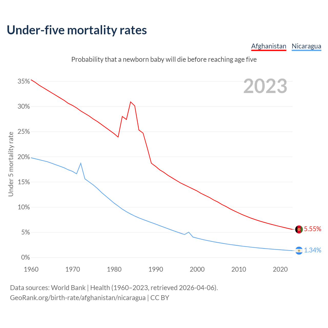 The chance that a newborn baby will die before reaching age five is 5.55% in Afghanistan and 1.34% in Nicaragua. Above is a chart with historical data on under-five mortality rates.