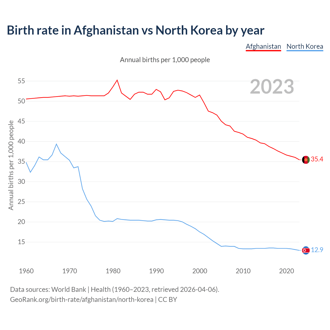 Afghanistan has an annual birth rate of 35.4 births per 1,000 people, compared to 12.9 for North Korea. The average number of children a woman is expected to have during her lifetime — the fertility rate, is 4.84 in Afghanistan and 1.78 in North Korea — 63.2% difference.