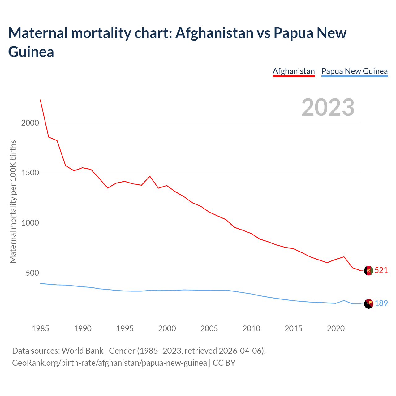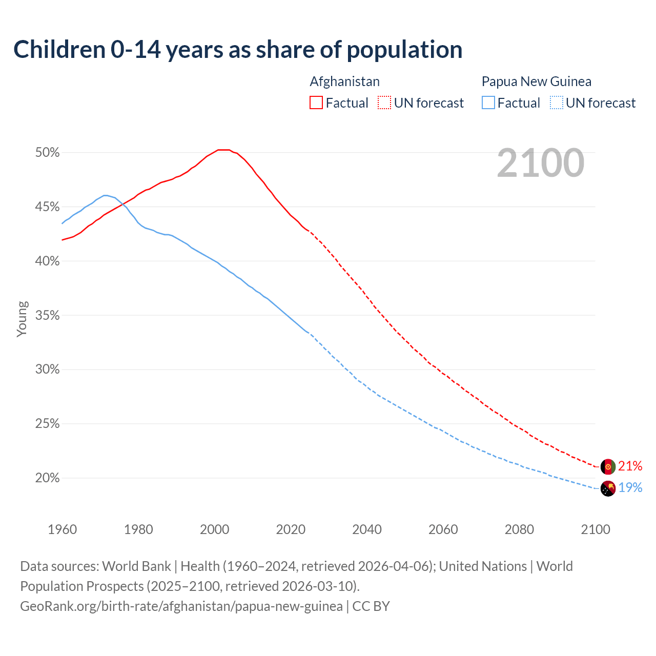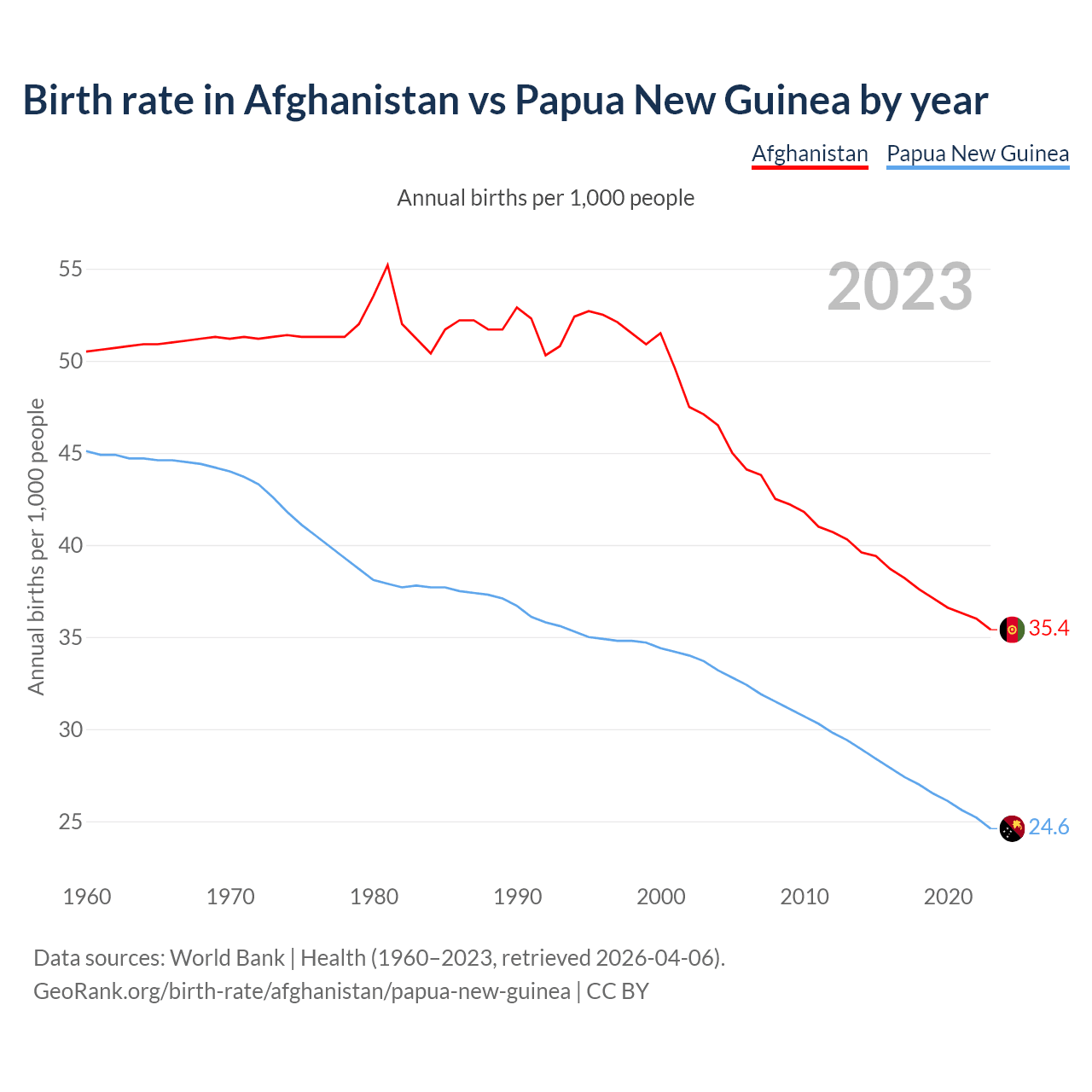 Afghanistan has an annual birth rate of 35.4 births per 1,000 people, compared to 24.6 for Papua New Guinea. The average number of children a woman is expected to have during her lifetime — the fertility rate, is 4.84 in Afghanistan and 3.1 in Papua New Guinea — 36% difference.