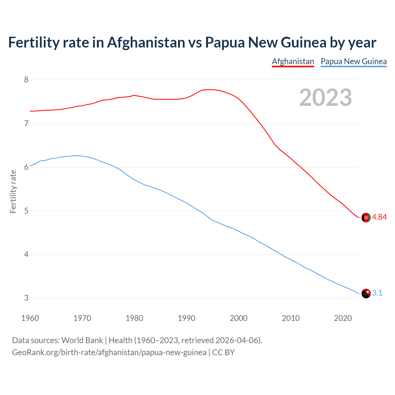 1960 vs 2023, the fertility rate has decreased by 33.5% in Afghanistan and by 48.5% in Papua New Guinea — in 1960, it was 7.28 and 6.02, respectively.