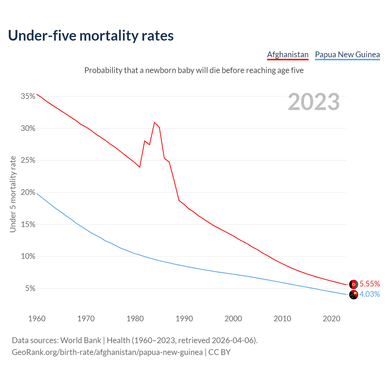 The chance that a newborn baby will die before reaching age five is 5.55% in Afghanistan and 4.03% in Papua New Guinea. Above is a chart with historical data on under-five mortality rates.