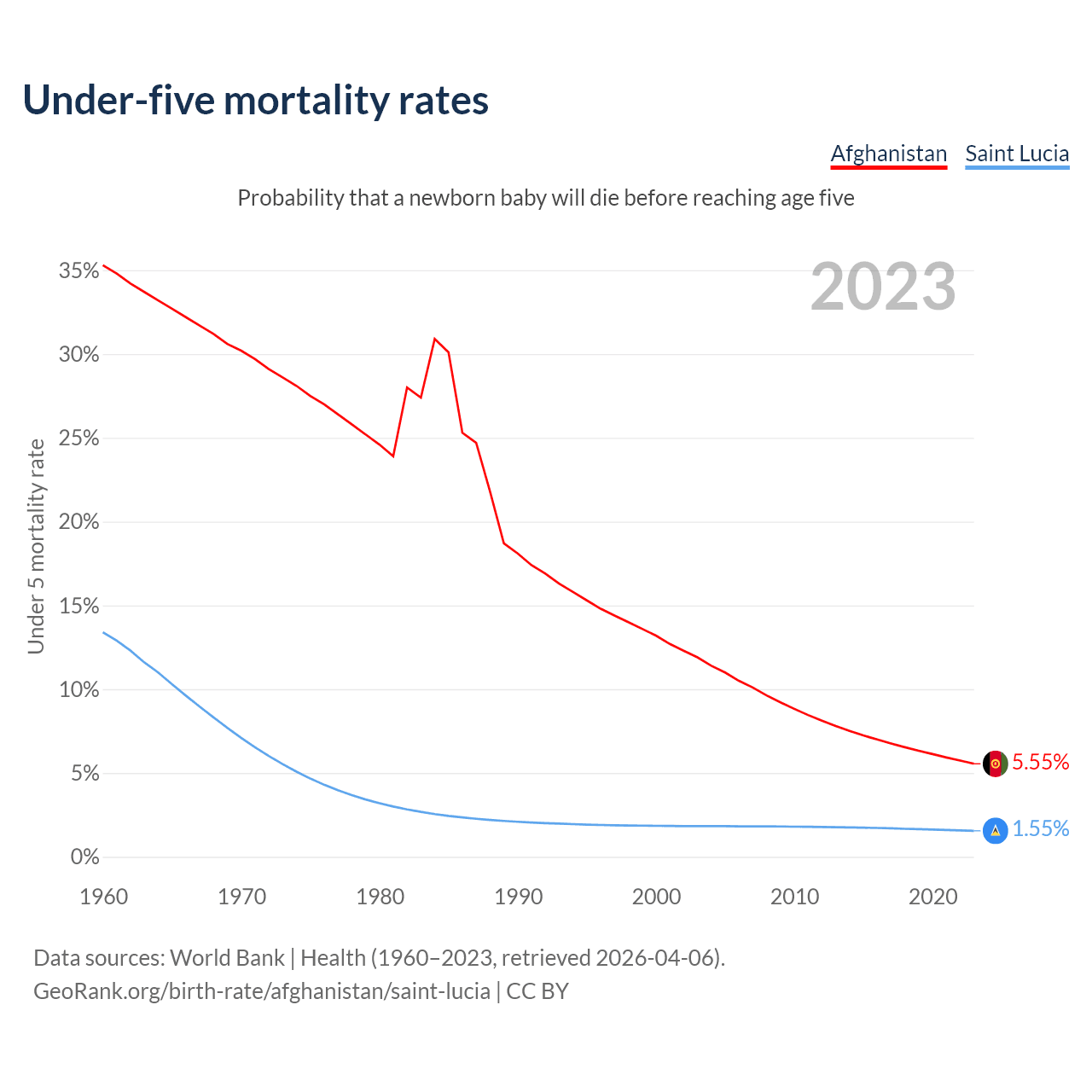 The chance that a newborn baby will die before reaching age five is 5.55% in Afghanistan and 1.55% in Saint Lucia. Above is a chart with historical data on under-five mortality rates.
