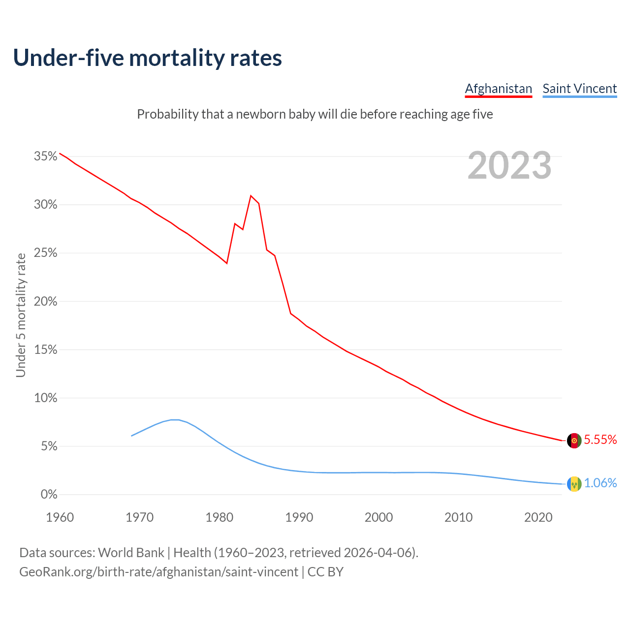 The chance that a newborn baby will die before reaching age five is 5.55% in Afghanistan and 1.06% in Saint Vincent. Above is a chart with historical data on under-five mortality rates.