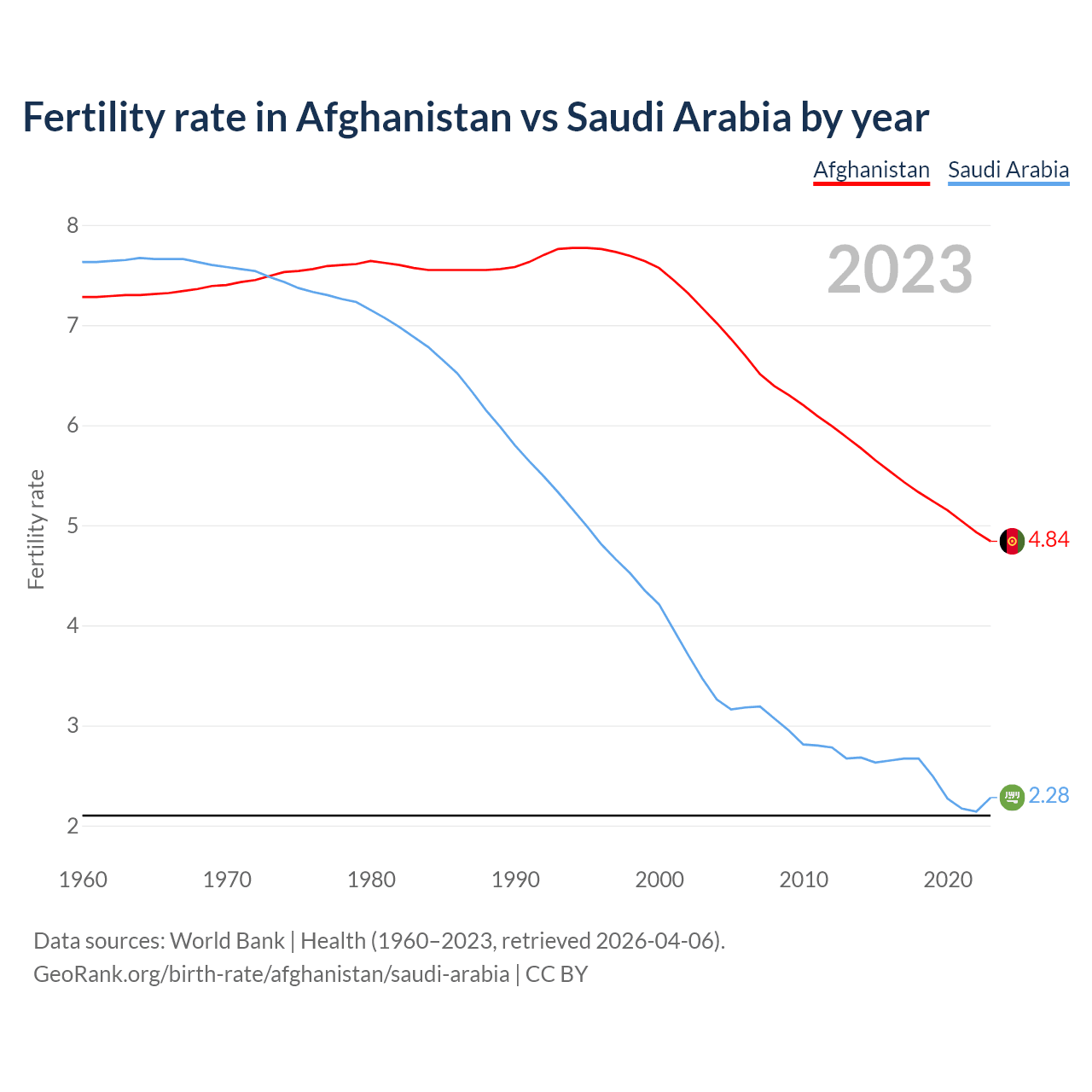 1960 vs 2023, the fertility rate has decreased by 33.5% in Afghanistan and by 70.1% in Saudi Arabia — in 1960, it was 7.28 and 7.63, respectively.