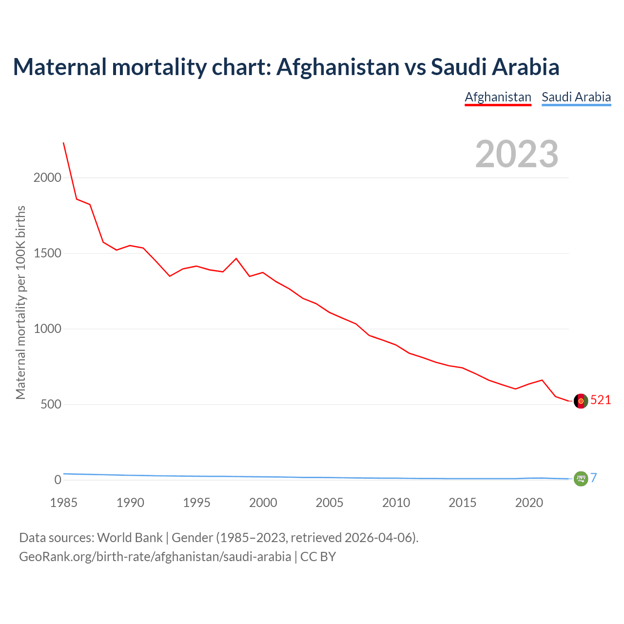 The maternal mortality rate, which is the probability of dying during childbirth or within 42 days of pregnancy termination, is 521 deaths per 100,000 live births in Afghanistan, compared to 7 deaths in Saudi Arabia.