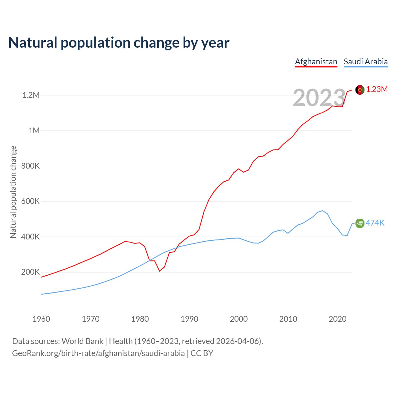 Afghanistan has an annual birth rate of 35.4 births per 1,000 people, compared to 16.4 for Saudi Arabia. The average number of children a woman is expected to have during her lifetime — the fertility rate, is 4.84 in Afghanistan and 2.28 in Saudi Arabia — 52.9% difference.