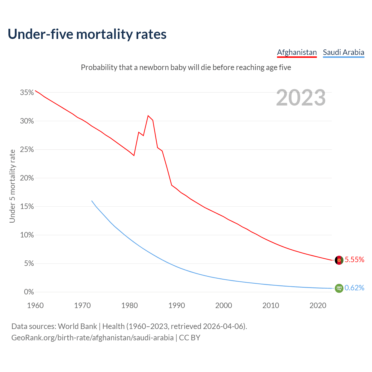 The chance that a newborn baby will die before reaching age five is 5.55% in Afghanistan and 0.62% in Saudi Arabia. Above is a chart with historical data on under-five mortality rates.