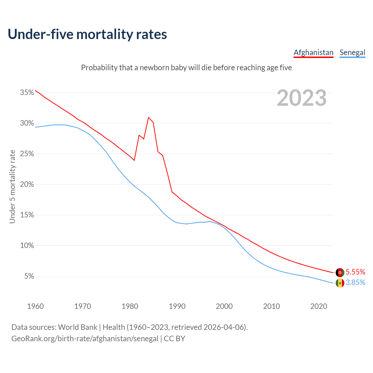 The chance that a newborn baby will die before reaching age five is 5.55% in Afghanistan and 3.85% in Senegal. Above is a chart with historical data on under-five mortality rates.