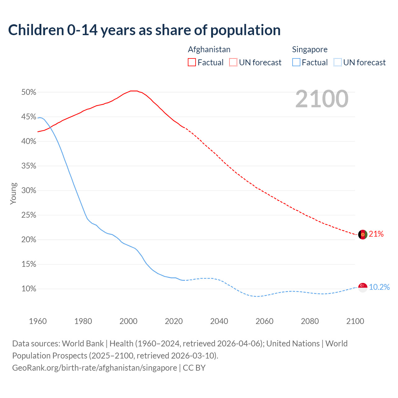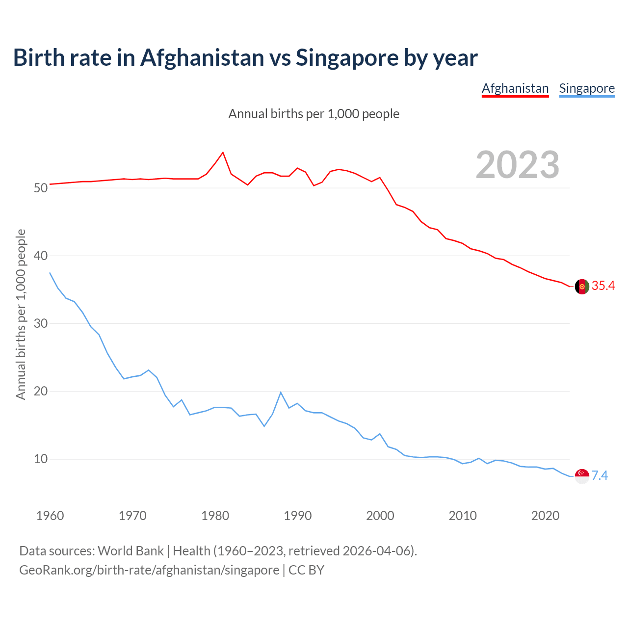 Afghanistan has an annual birth rate of 35.4 births per 1,000 people, compared to 7.4 for Singapore. The average number of children a woman is expected to have during her lifetime — the fertility rate, is 4.84 in Afghanistan and 0.97 in Singapore — 80% difference.