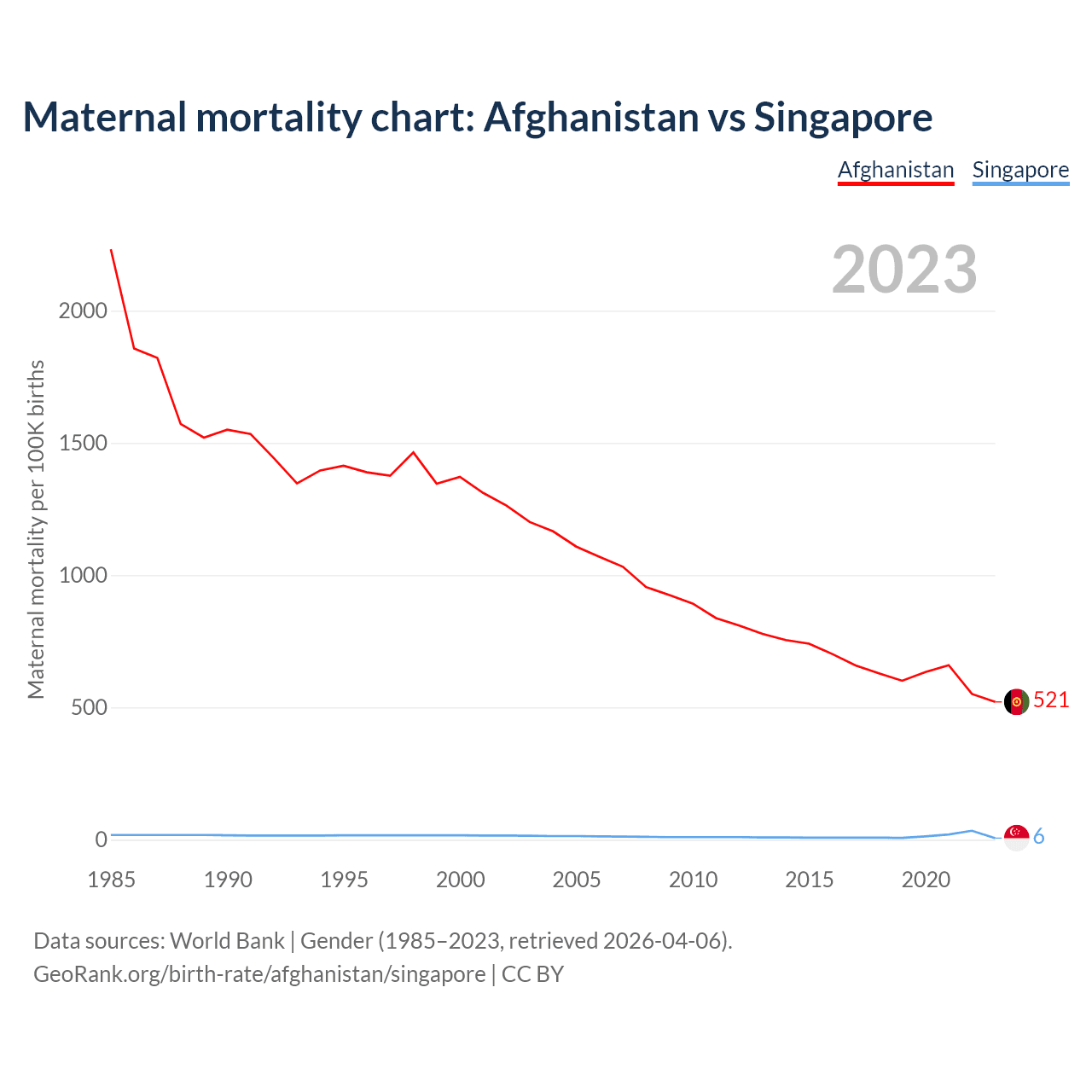 The maternal mortality rate, which is the probability of dying during childbirth or within 42 days of pregnancy termination, is 521 deaths per 100,000 live births in Afghanistan, compared to 6 deaths in Singapore.